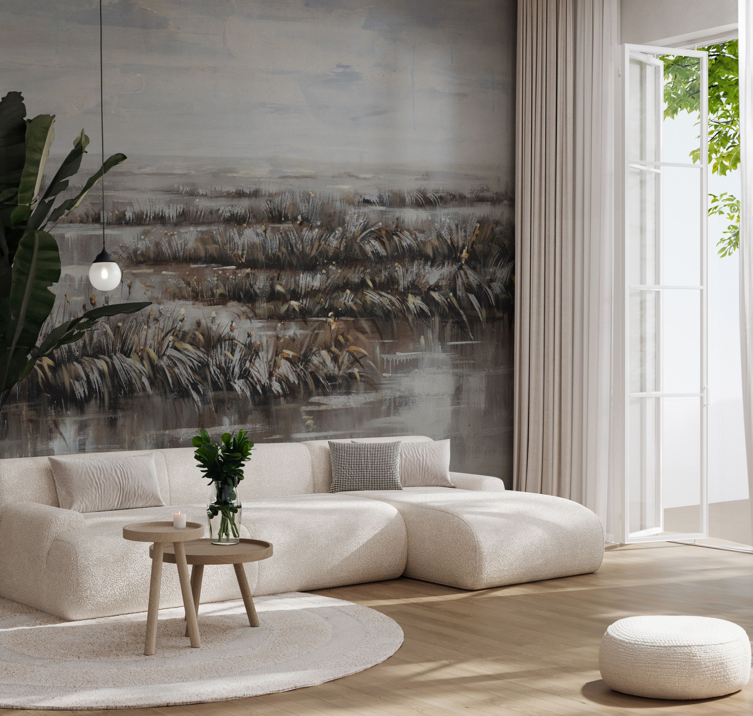 Wprowadź do swojego wnętrza wyjątkowy klimat kontemplacji i spokoju dzięki fototapecie „Cisza mokradeł”. Ta nastrojowa kompozycja inspirowana dziką naturą ukazuje rozległe mokradła spowite mgłą i odbijające się w tafli wody trawy. Subtelne przejścia kolorystyczne oparte na odcieniach szarości, brązu i błękitów tworzą atmosferę ciszy i bezruchu, idealnie pasującą do wnętrz nowoczesnych, skandynawskich i minimalistycznych.