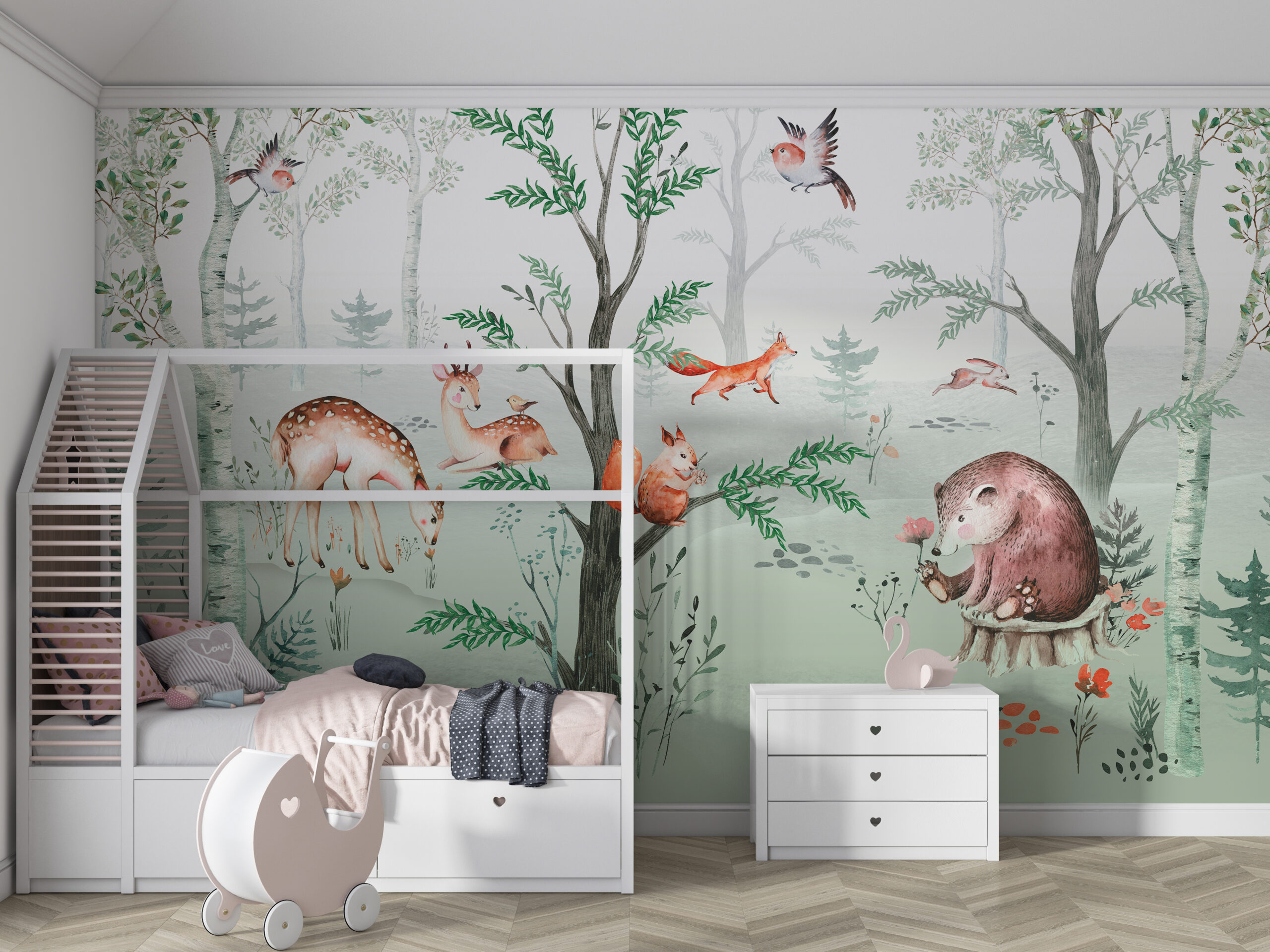 - Animalele din pădure reprezentate în pictura murală, cum ar fi cerbi, vulpi, urși sau păsări, adaugă caracter și farmec camerei.