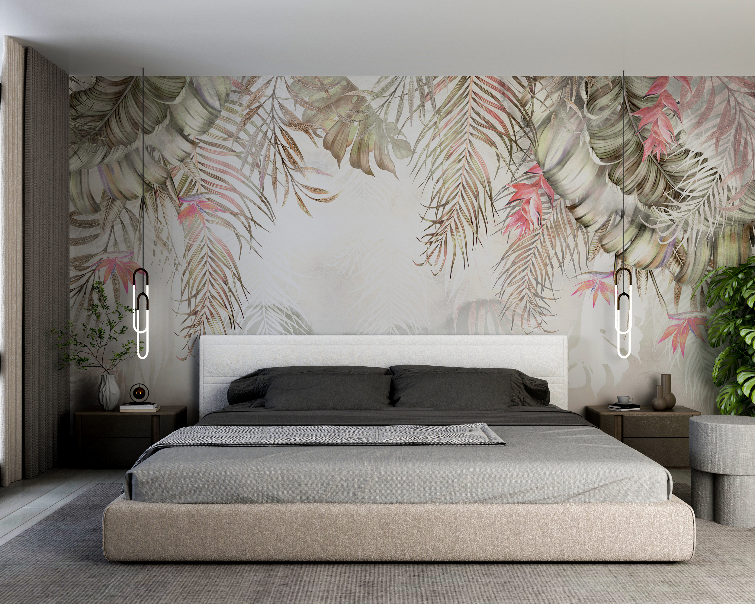 Această pictură murală fermecătoare de perete prezintă frunze roz delicate pe un fundal subtil. Cu acest model, interiorul devine proaspăt și luminos, dând camerei o senzație confortabilă și naturală.