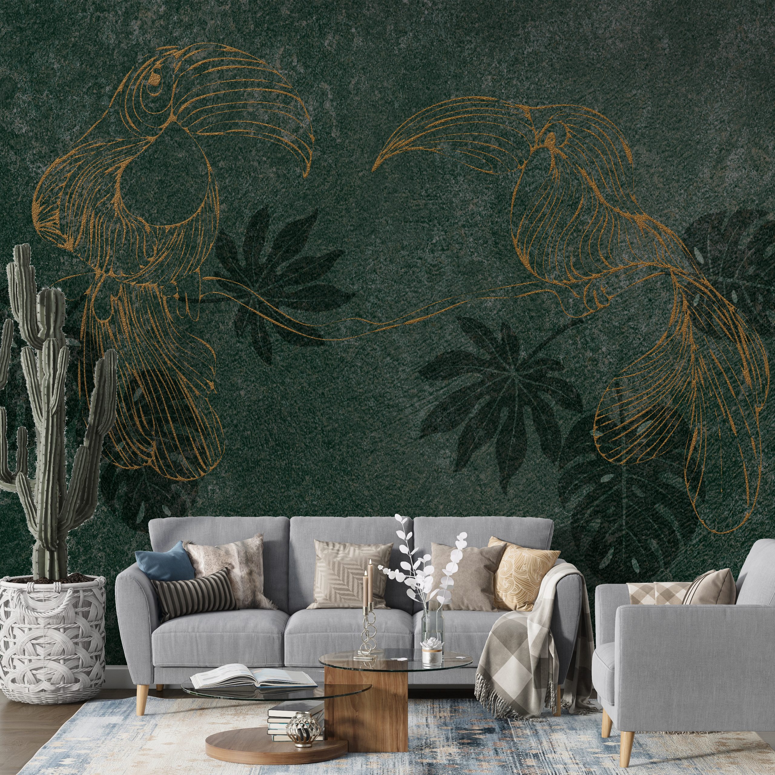 Transportă-te într-o junglă tropicală cu pictura murală care înfățișează tucani aurii! Aceste păsări frumoase și pline de culoare vor adăuga caracter oricărei camere, făcând-o unică și atrăgând privirile oaspeților.