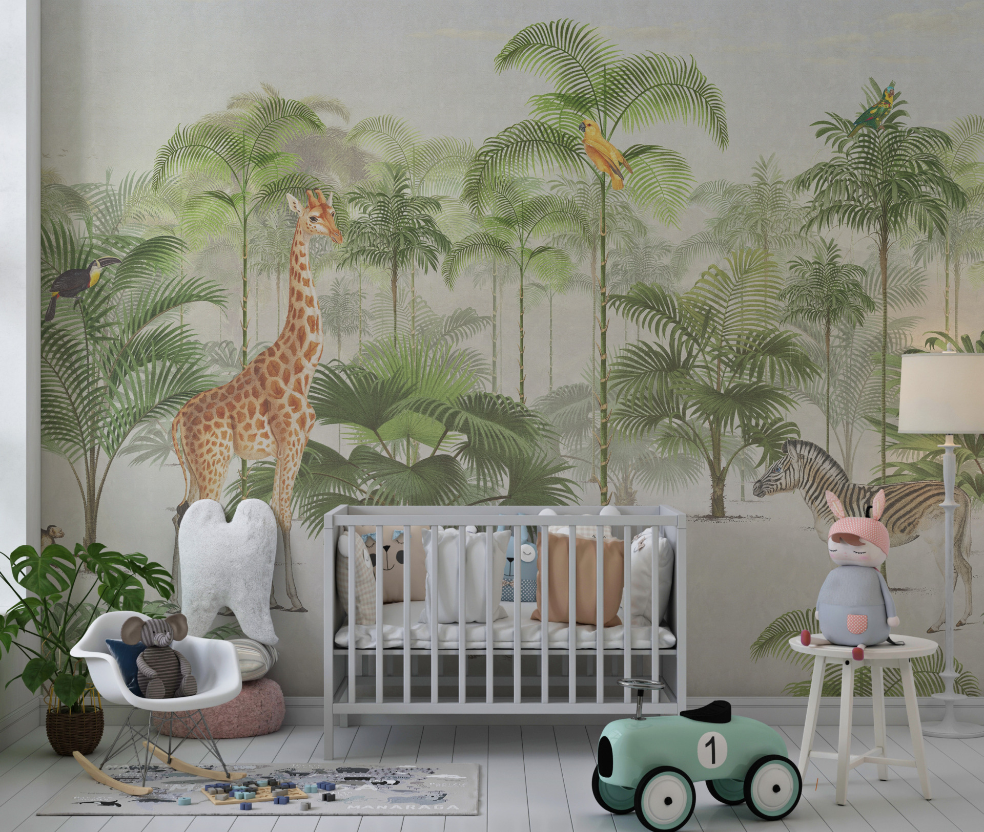 Girafa este un animal asociat cu eleganța și liniștea, așa că prezența acestui motiv în interiorul dvs. va influența crearea unei atmosfere plăcute de relaxare și odihnă. În plus, verdele intens va da camerei un aer proaspăt și energic, ceea ce este util mai ales în zonele destinate relaxării.