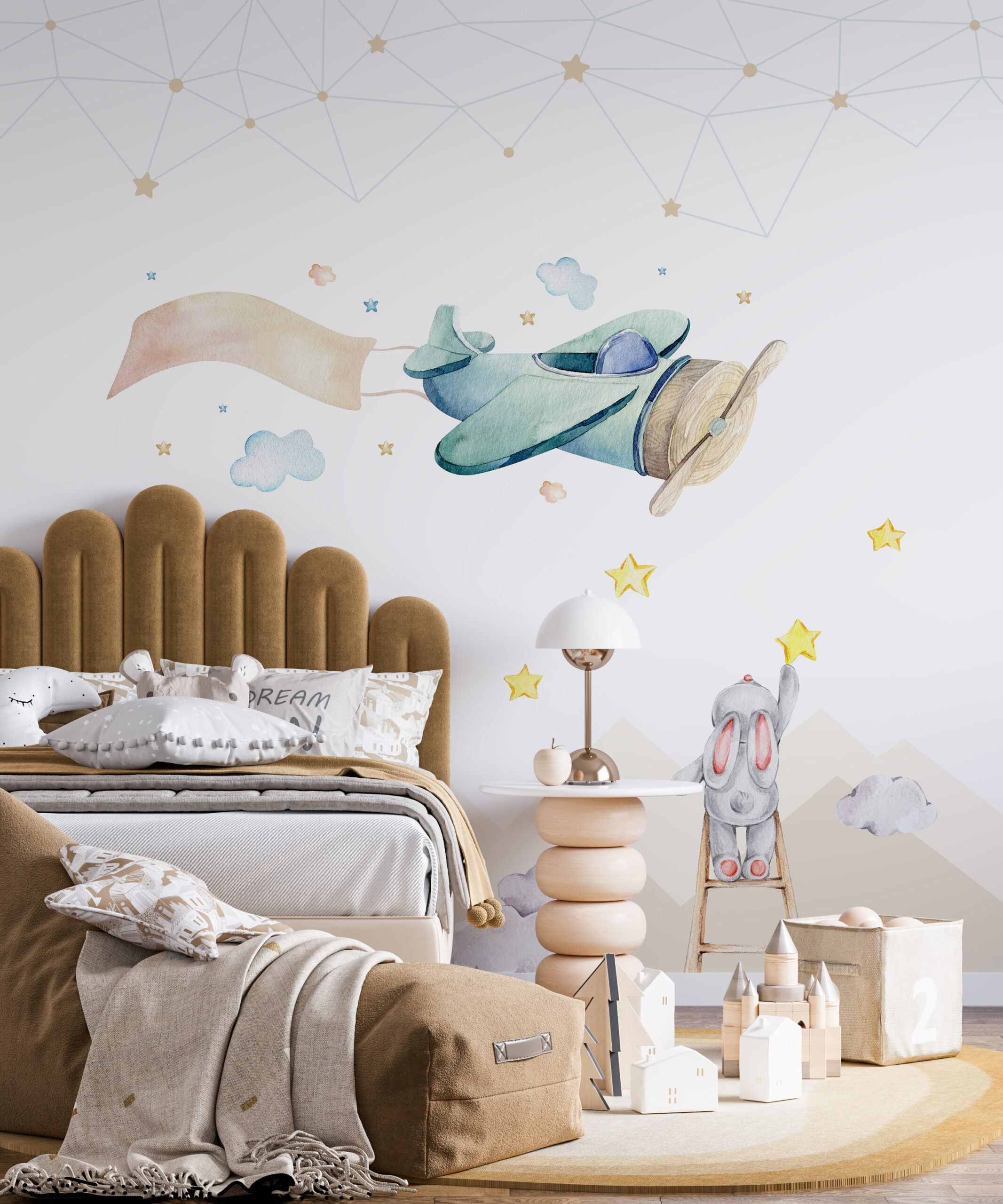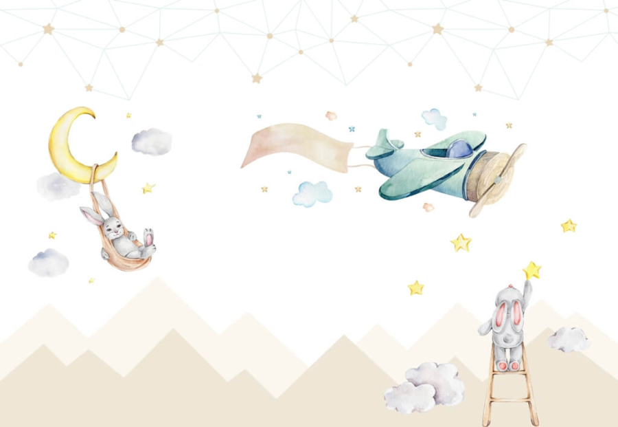 Sunteți în căutarea unei decorațiuni unice pentru camera dumneavoastră? Această pictură murală de iepurași pe cer va fi o alegere excelentă!