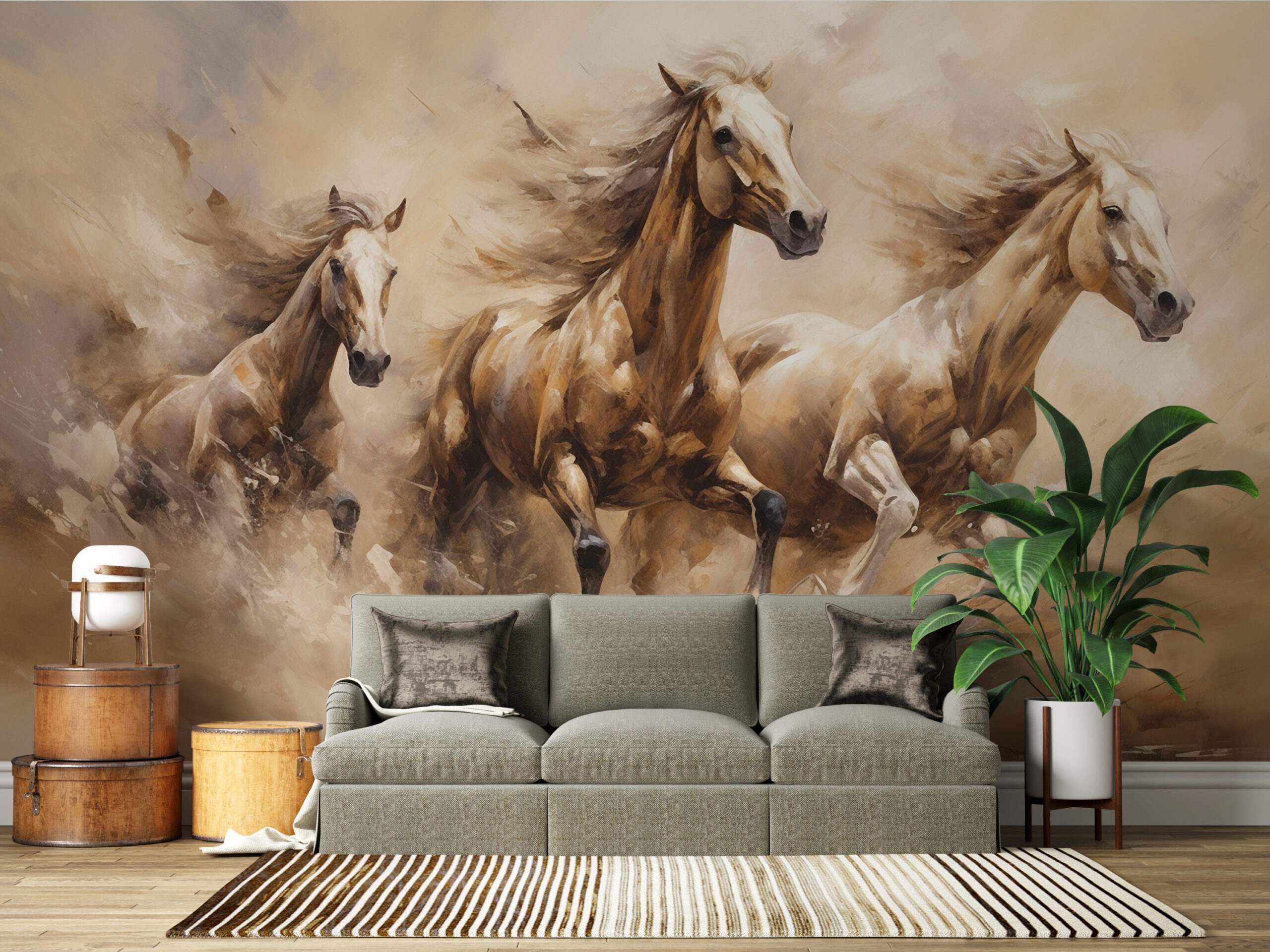 Această uimitoare pictură murală de perete reprezintă o scenă frumoasă de cai în fugă, adăugând dinamism și energie oricărei încăperi în care este amplasată.
