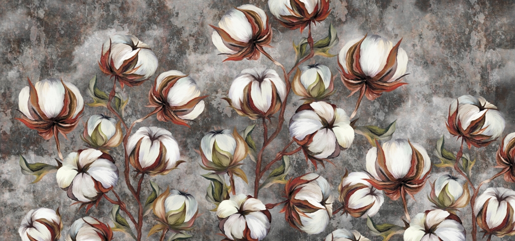 O pictură murală potrivită pentru toți cei care apreciază elementele de design interior originale, originale. Florile de bumbac extrem de elegante și stilate au fost plasate pe un fundal gri, creând o compoziție care ar fi perfectă pentru orice cameră. Aceasta este o alegere bună dacă sunteți în căutarea unui mod interesant de a aranja un perete în apartamentul dumneavoastră. Pictura murală se va potrivi perfect cu un interior în stil modern. Datorită motivului de pe ea, va fi potrivită și pentru o cameră rustică.