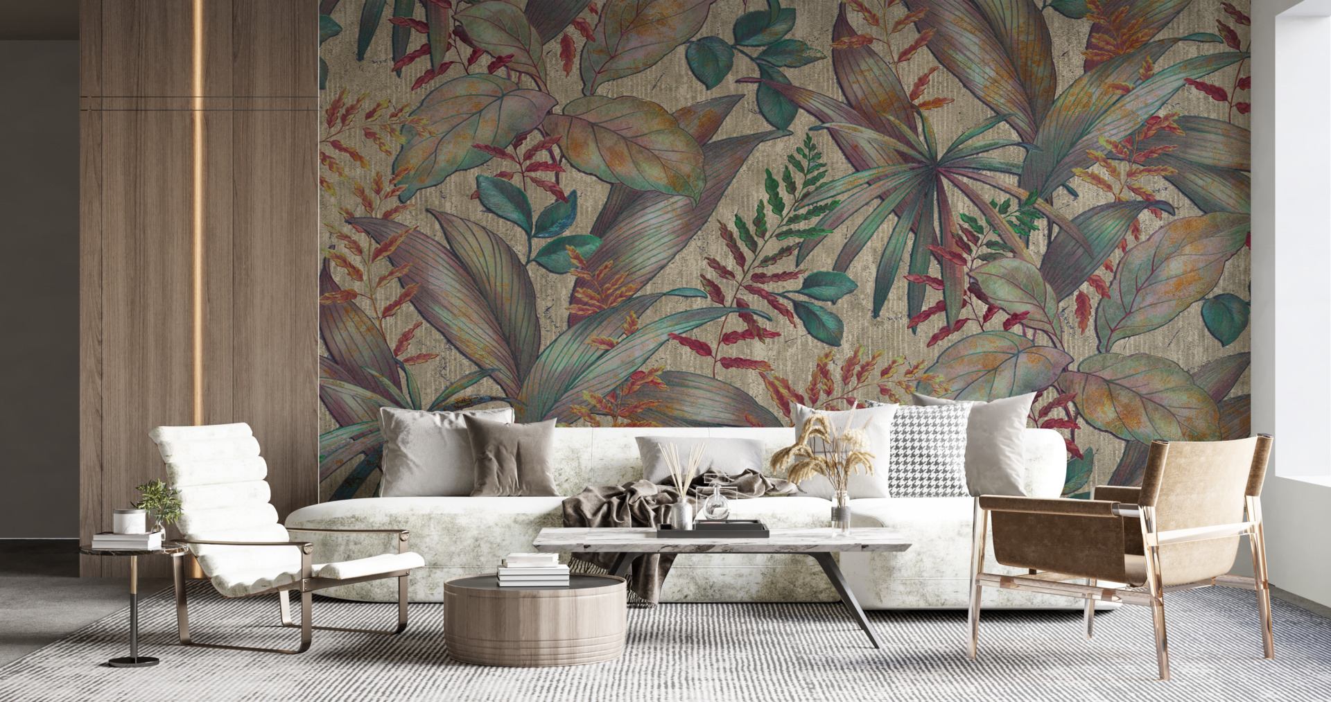 Frunzele în culori intense, cum ar fi verde, galben, roșu și violet, vor da camerei tale un aer exotic. Datorită manoperei sale atente și a materialului de înaltă calitate, pictura murală de la Lamural vă va împodobi peretele timp de mulți ani.