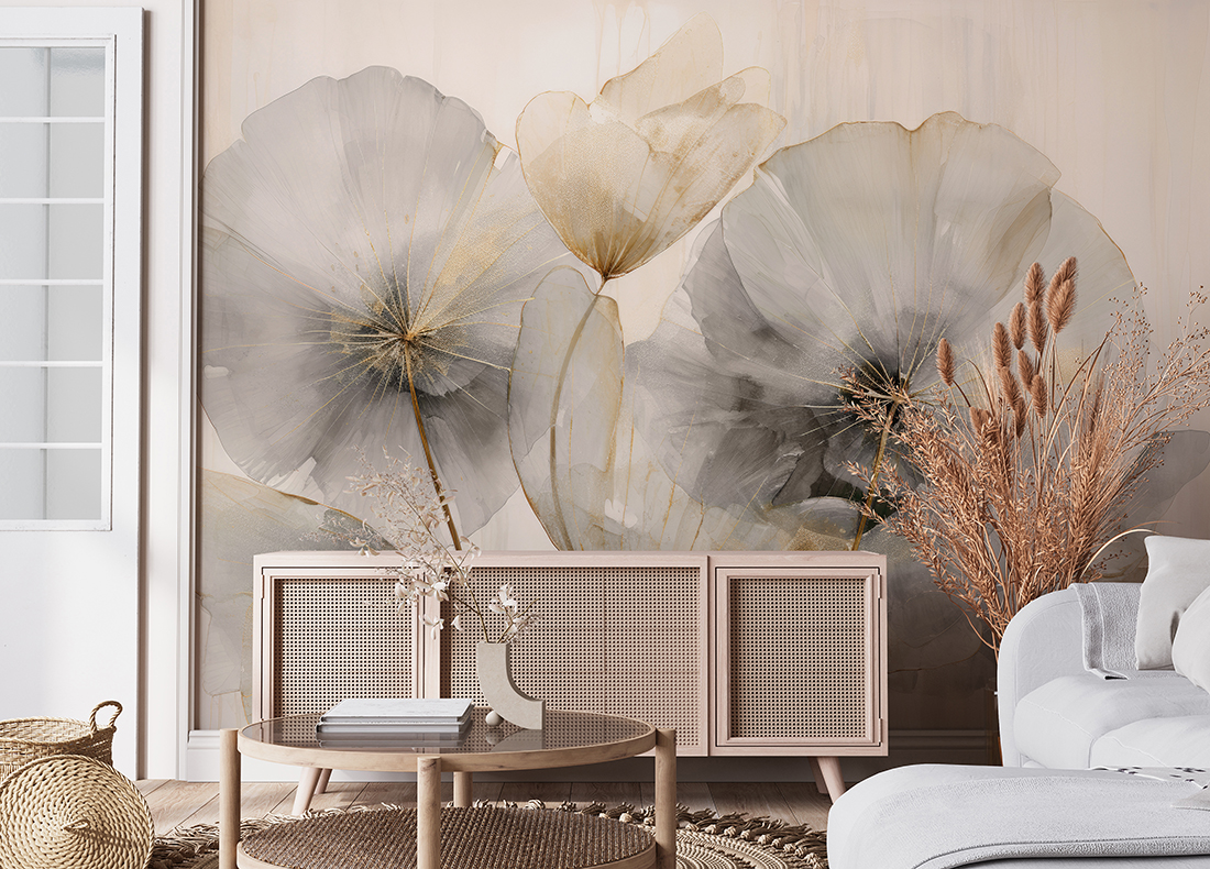 Cu o paletă de culori stinse de bej, gri și alb rupte, pictura murală se îmbină frumos cu materialele naturale și interioarele clasice. Ideală pentru camera de zi, dormitor sau birou elegant, aceasta creează un spațiu plin de lumină, respirație și simplitate elegantă.