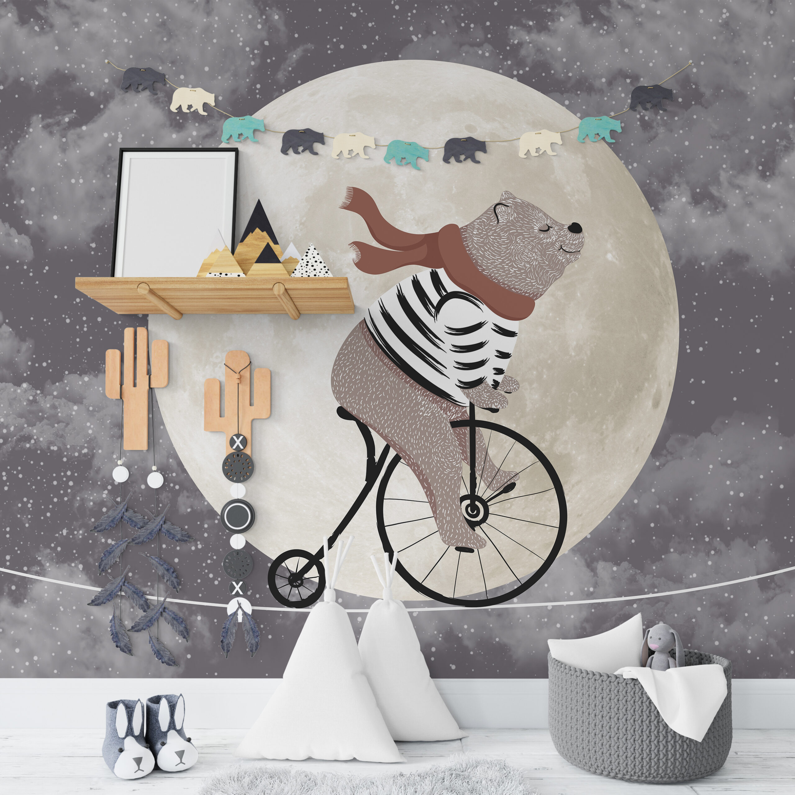 Sunteți în căutarea unei decorațiuni neobișnuite pentru camera dumneavoastră? Această pictură murală este alegerea ideală pentru cei care apreciază designul original. Acesta prezintă un ursuleț de pluș adorabil care se plimbă pe frânghii sub o lună plină.