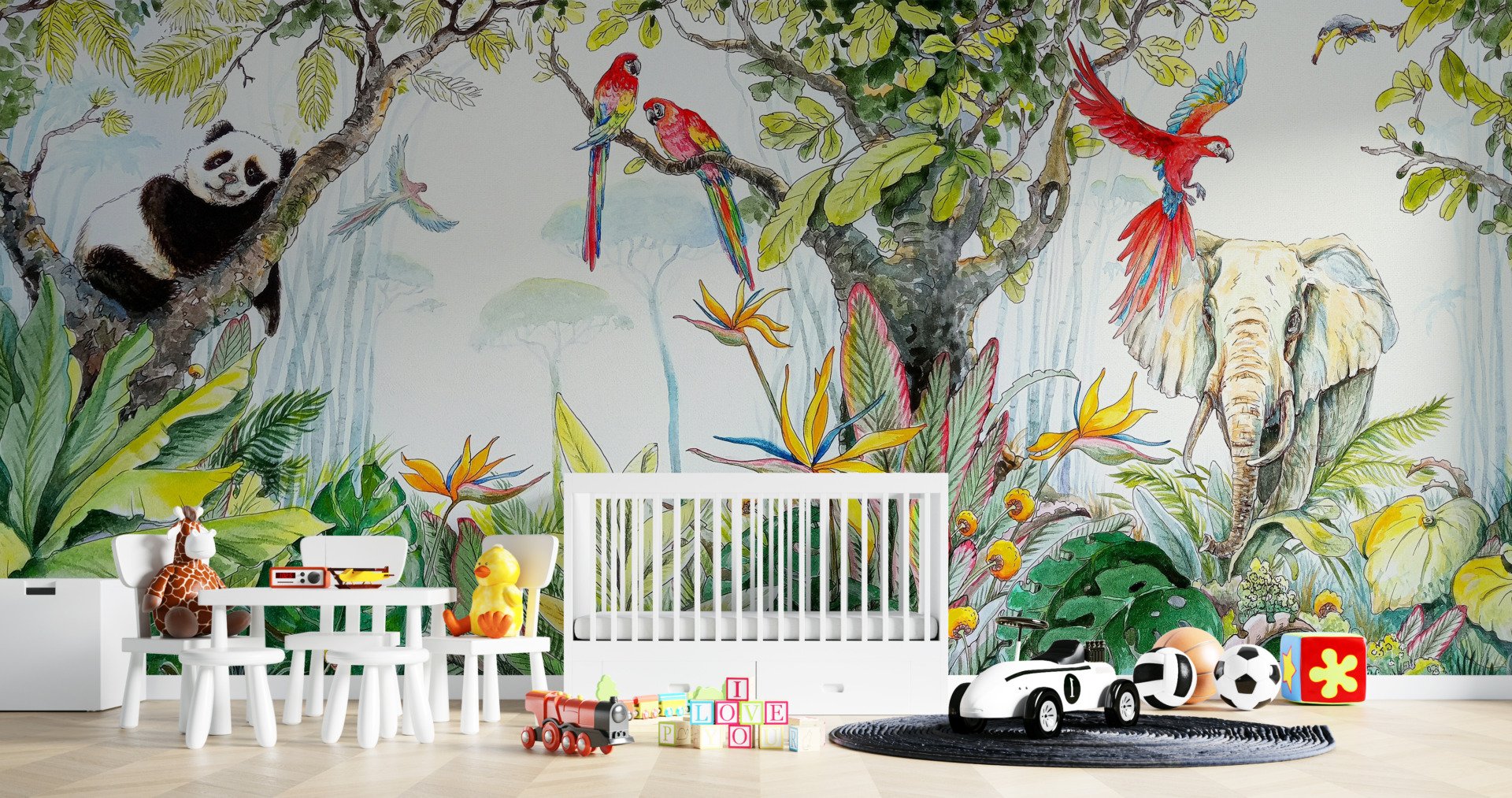 Papagalii roșii în junglă este un motiv care atrage imediat privirea și adaugă o notă exotică oricărei încăperi. Această pictură murală de perete este ideală pentru cei care visează la o aventură tropicală în propria casă.
