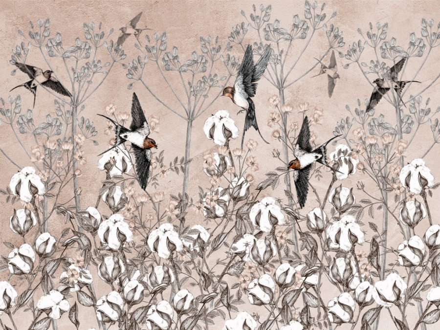 Oferiți interiorului dvs. un aspect original și proaspăt cu tapetul foto Birds in Cotton Blossoms!