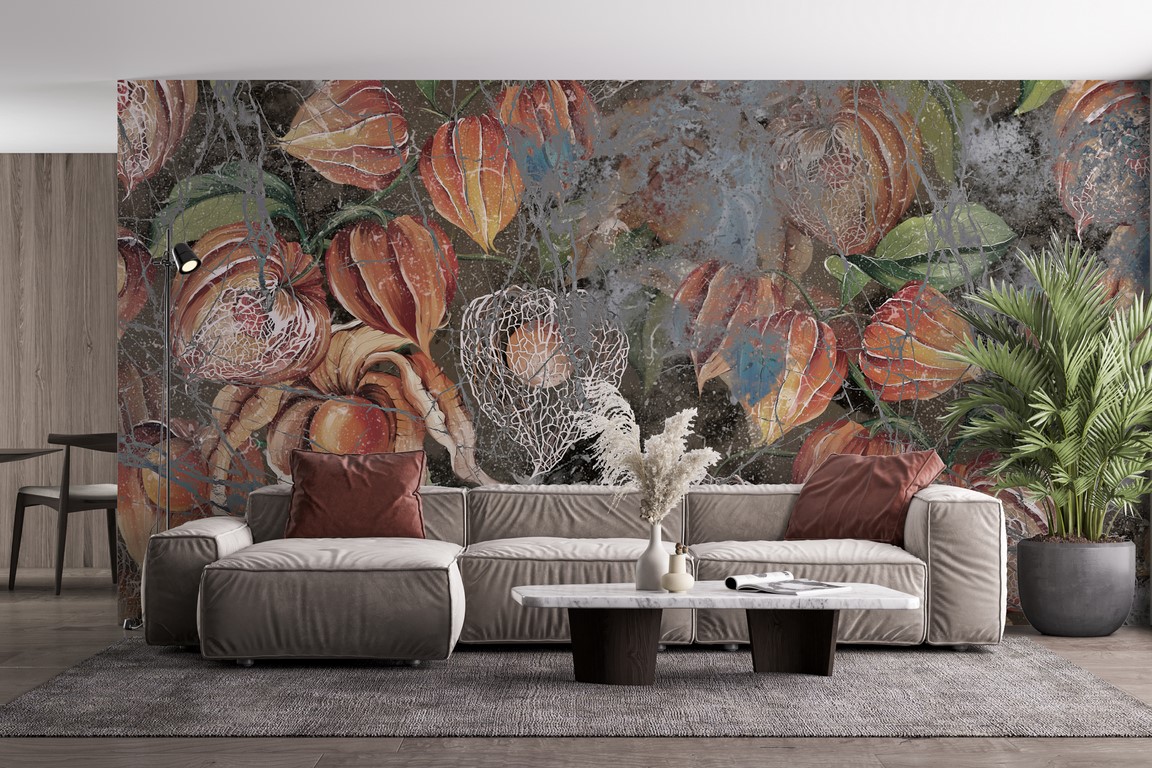 Dacă vă place un stil rustic, natural în designul interior, această pictură murală va fi adăugarea perfectă la spațiul dvs. Pictura murală care înfățișează flori uscate portocalii va conferi camerei dvs. o atmosferă caldă și confortabilă.
