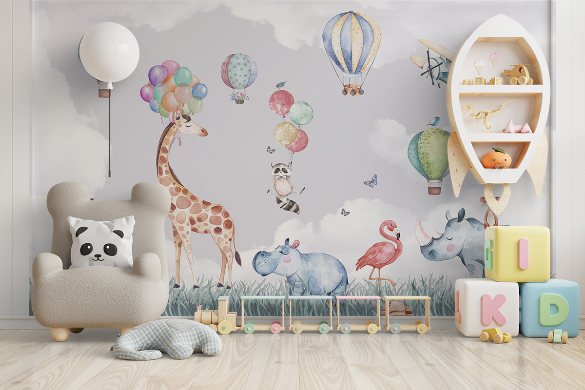 Pictură murală a unei girafe cu baloane