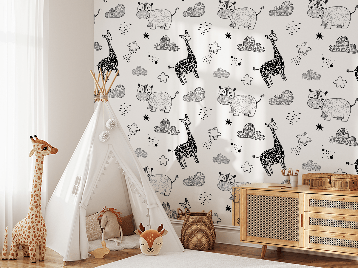 Aduceți o atmosferă magică în interiorul dvs. cu fototapetul „Animalele din nori”. Acest model fermecător alb-negru, cu imagini cu girafe și hipopotami, înconjurate de nori și stele, va crea o atmosferă veselă și de basm în casa dvs. Linii delicate, personaje jucăușe și culori subtile sunt perfecte pentru camerele copiilor, grădinițe și spații pline de imaginație.