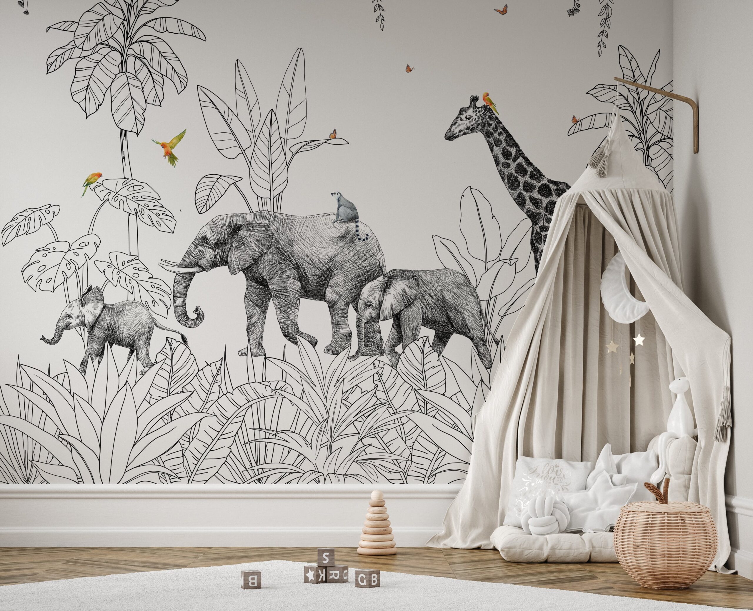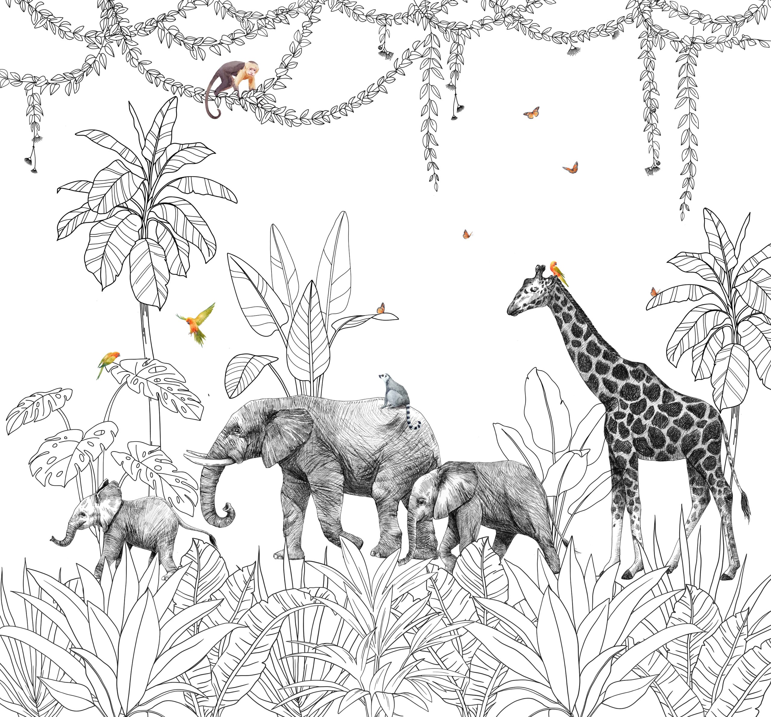Cufundă-te în lumea extraordinară a naturii sălbatice cu tapetul foto „Jungle Harmony”. Această ilustrație fermecătoare înfățișează animale vesele, precum elefanți, girafe și maimuțe, care cutreieră armonios o junglă tropicală plină de plante luxuriante și păsări colorate. Combinația de desene delicate alb-negru cu accente de culoare intensă creează o atmosferă caldă și veselă în spațiu.