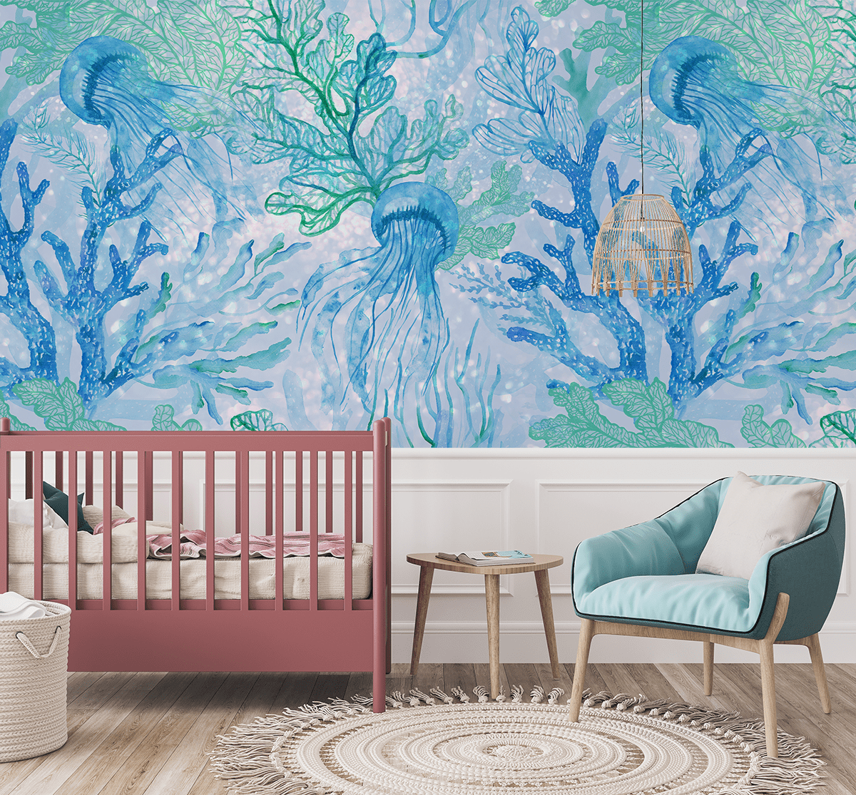 Aduceți lumea uimitoare a oceanului în camera copilului dumneavoastră cu tapetul foto „Armonie subacvatică”. Această ilustrație colorată înfățișează meduze vesele și plante marine în nuanțe frumoase de albastru și verde, creând o atmosferă prietenoasă și liniștită. Copiii se vor simți ca într-un basm, cufundați într-o lume subacvatică misterioasă.