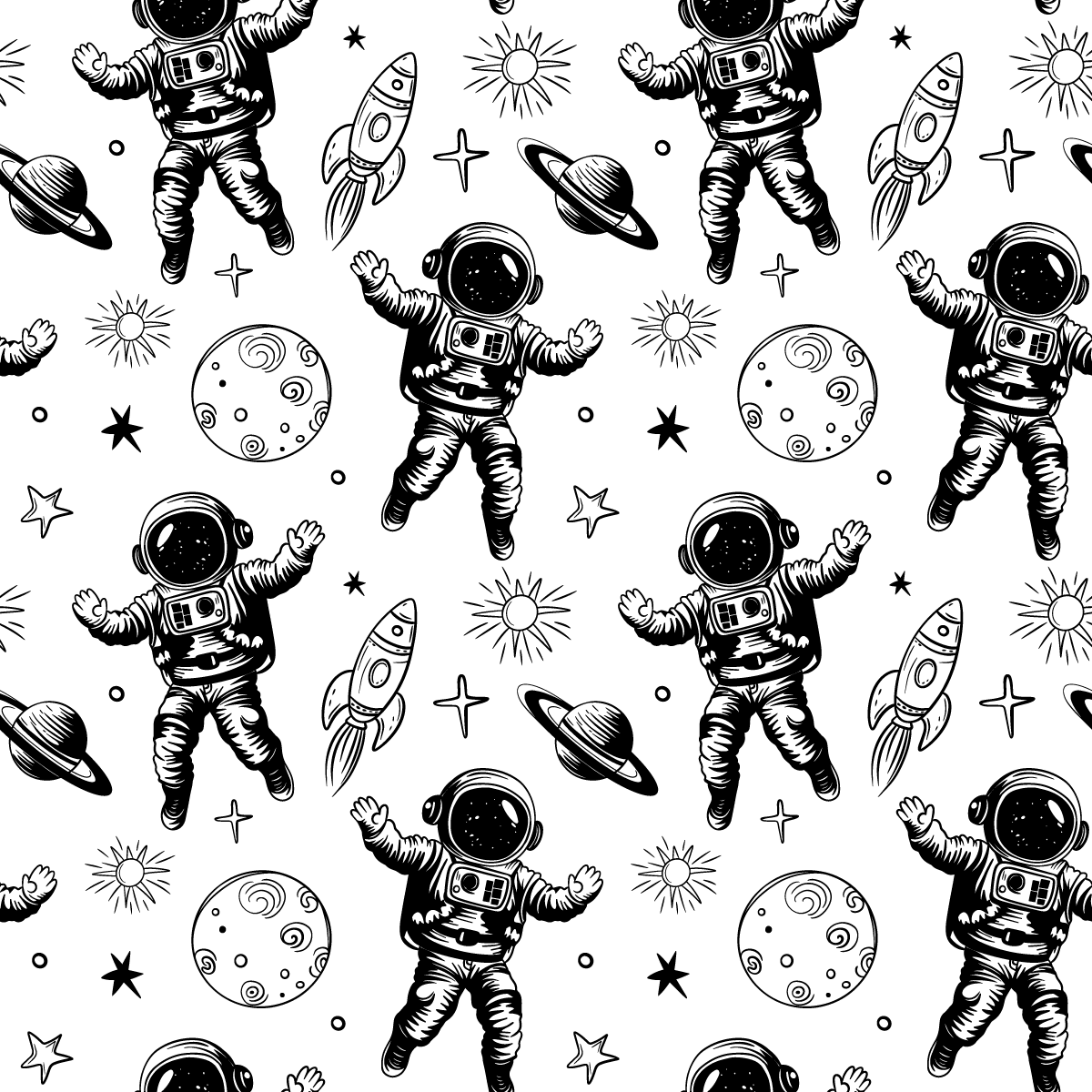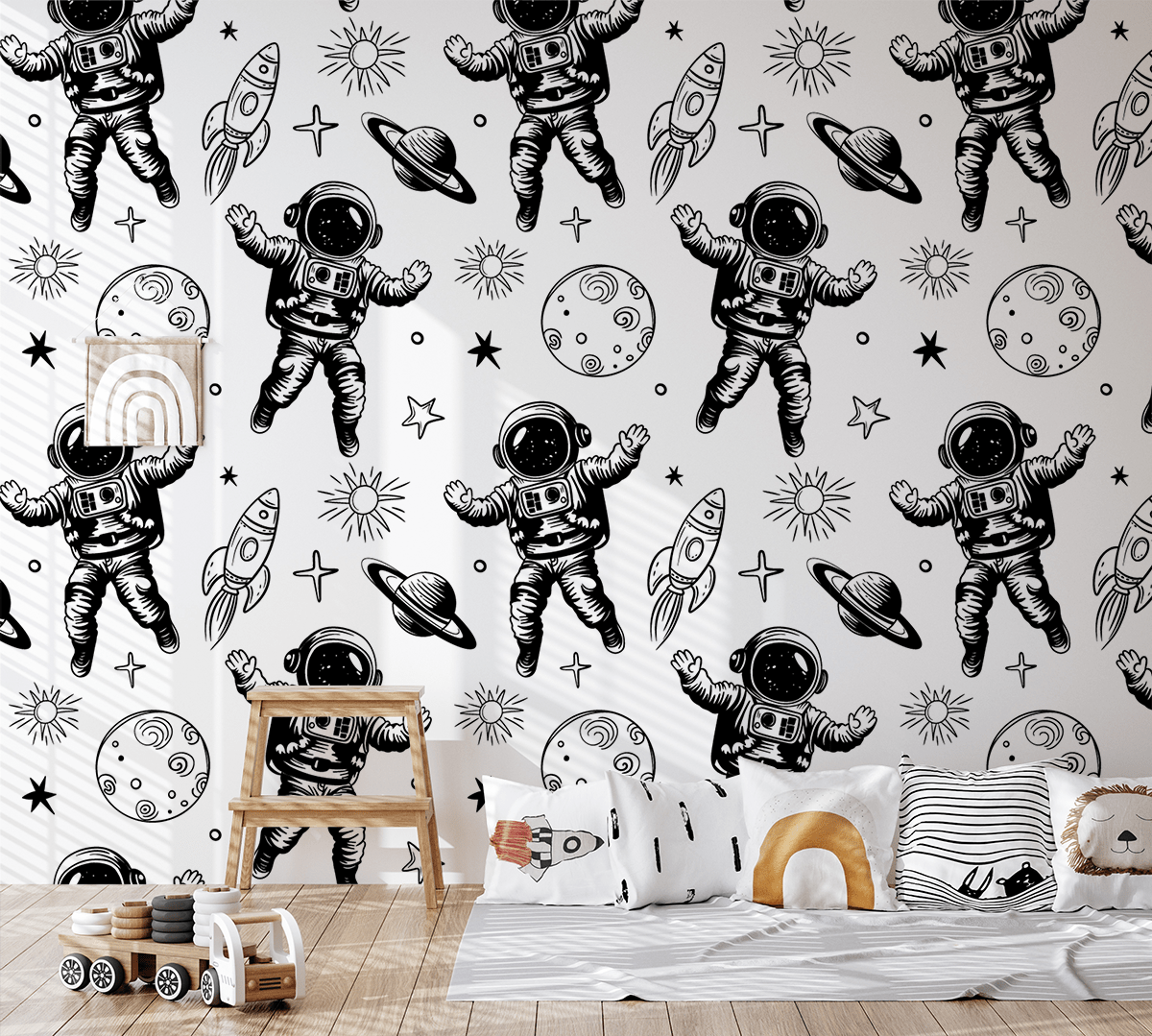 Transportă-ți copilul în lumea fascinantă a expedițiilor interplanetare cu fototapetul „Astronauți în Galaxie”. Acest model alb-negru, atent conceput, înfățișează astronauți curajoși, rachete, planete și stele, creând o compoziție dinamică și aventuroasă care stimulează imaginația și te încurajează să descoperi secretele universului.