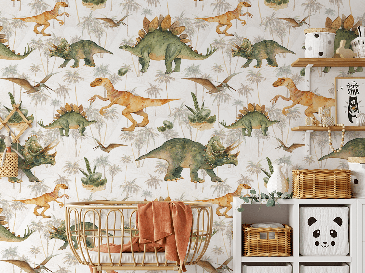 Perfect pentru camera unui copil, grădiniță sau cameră de joacă, acest fototapet va adăuga energie și creativitate interiorului, sprijinind dezvoltarea imaginației celui mai mic. Datorită acestuia, fiecare copil se va simți ca un mic explorator printre creaturi străvechi.