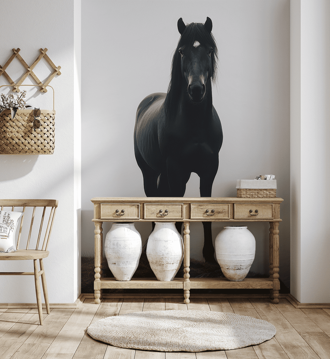 Fototapetul „Calul Negru” – putere maiestuoasă, atmosferă misterioasă și eleganța naturii într-un singur cadru