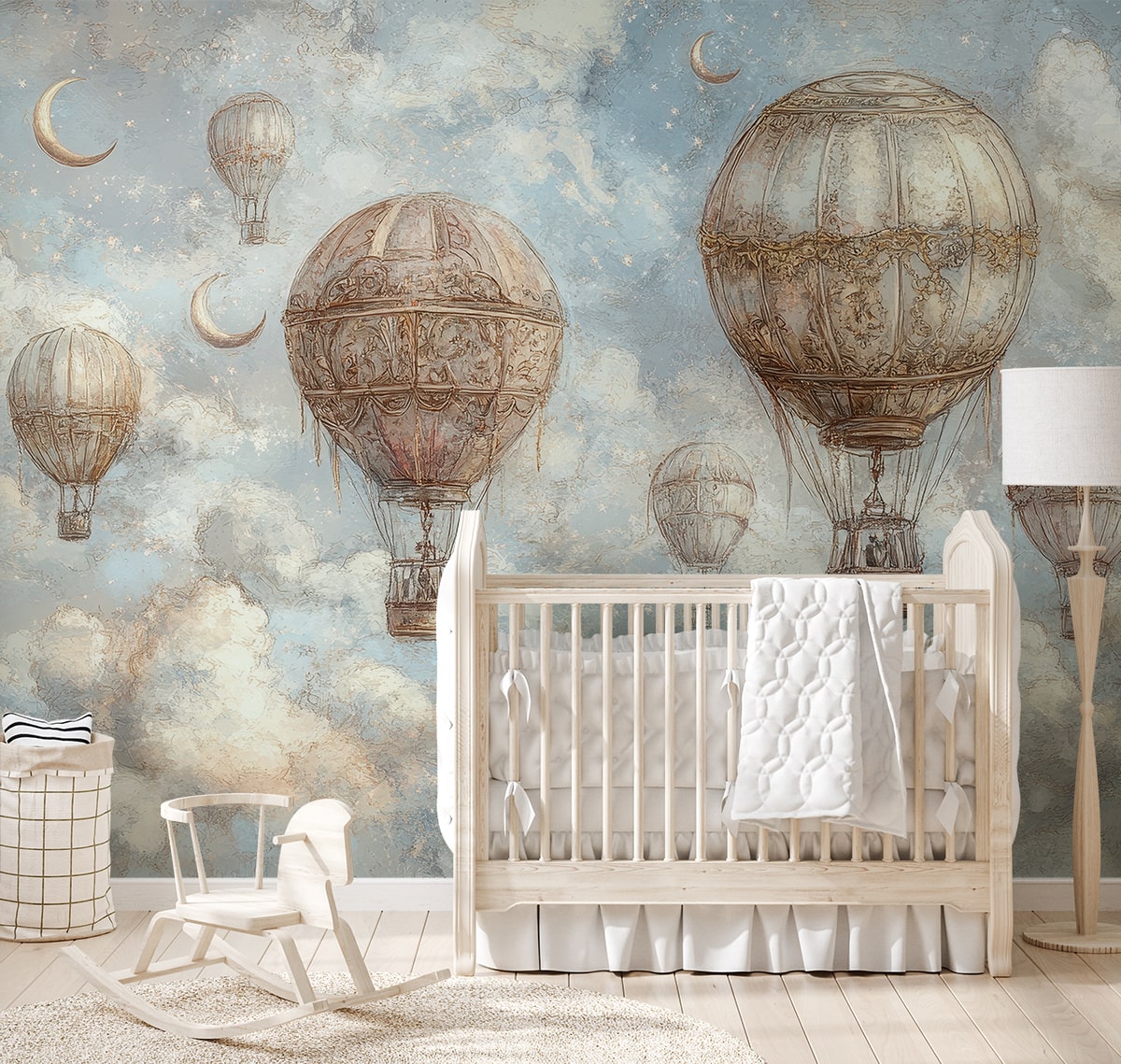 Oferă-i interiorului tău o atmosferă unică cu fototapetul „Sky of Balloon Dreams”. Acest motiv delicat, artistic, cu baloane plutind printre nori moi și luni, te va transporta într-o lume plină de pace, inspirație și imaginație nelimitată. Culorile pastelate, subtile, creează un spațiu armonios care promovează relaxarea și gândurile creative.