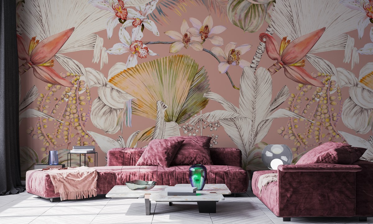 - 3D, ANIMALE, FRUNZE TROPICALE, NATURĂ, Pentru cameră, PENTRU DORMITOR, PENTRU SUFRAGERIE, Picturi murale, Culori, Modern, Nuanțe de roz, Stil