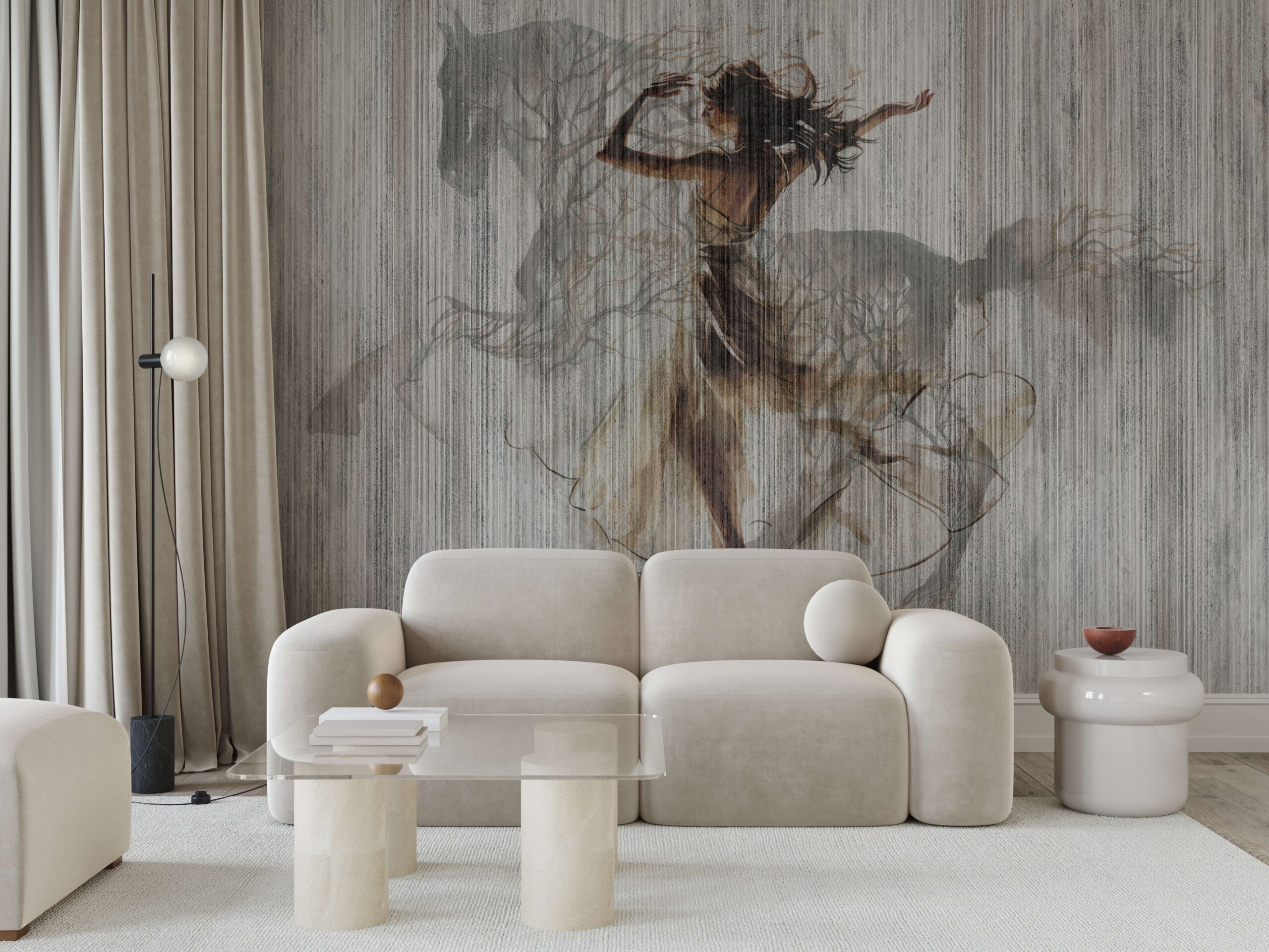 Aduceți magia artei subtile în interiorul dumneavoastră cu fototapetul „Dansul Naturii”. Această compoziție unică combină o siluetă feminină într-un extaz dansant cu conturul delicat al unui cal și motive organice care amintesc de ramurile copacilor. Întregul design este menținut în culori subtile, eterice, care introduc pace, poezie și profunzime artistică în spațiu.
