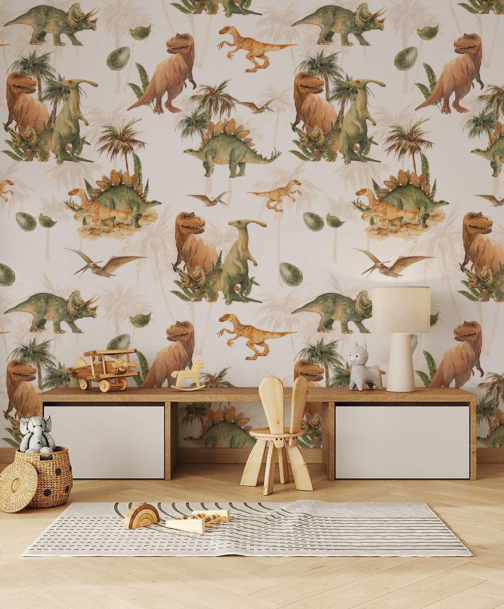 Fototapetul „Dinozauri din junglă” – o aventură preistorică, o atmosferă tropicală și o lume de basm pentru cei mici