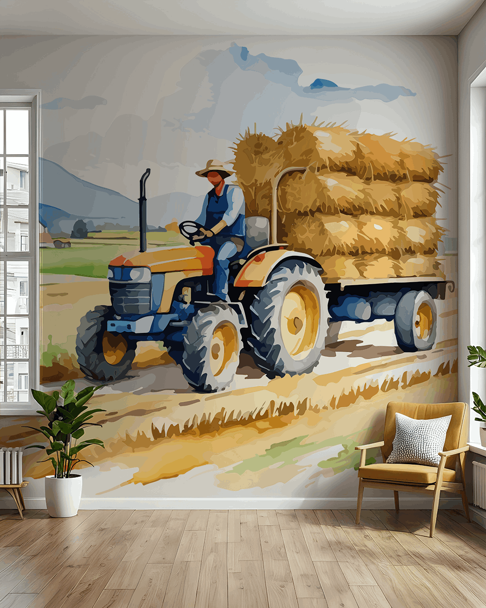 Adu o atmosferă unică în casa ta cu fototapetul „Straw Trail”. Acest motiv plin de viață, pictural, cu un tractor printre câmpuri și baloți de fân, te transportă direct pe un drum de țară liniștit, introducând o atmosferă de idilă și frumusețe naturală în interior. Nuanțele calde de auriu și un joc delicat de lumini creează o senzație de confort care completează perfect atât amenajările rustice, cât și pe cele moderne.