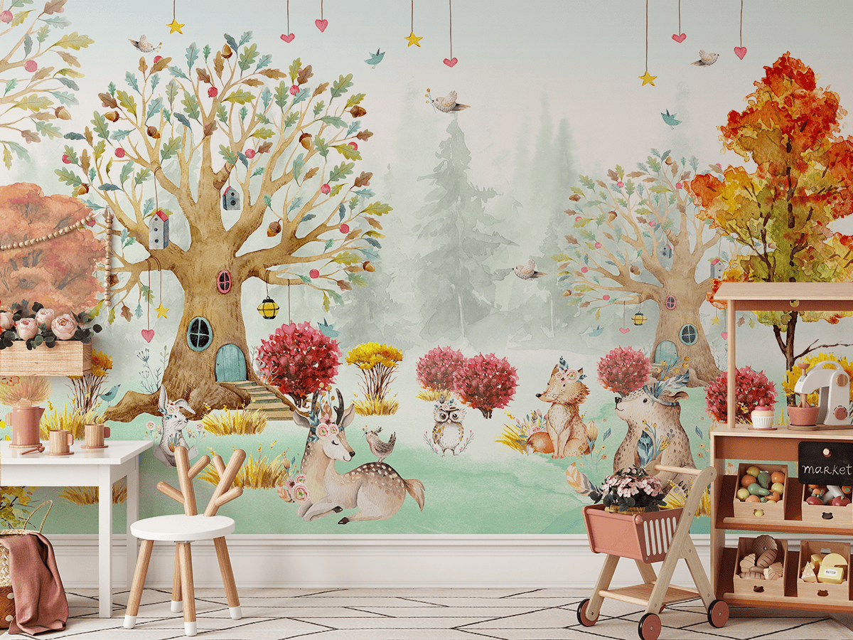 Fototapet „Dumbrava de basm cu animale” – o lume magică a prieteniei, culorilor și imaginației unui copil