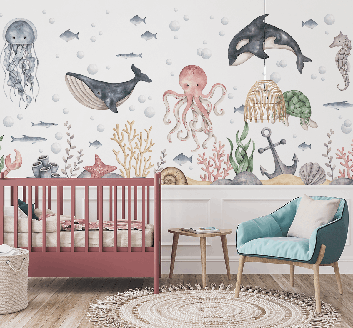 Este mai mult decât o simplă decorațiune – este o aventură colorată care transformă camera unui copil într-un tărâm de basm plin de prieteni din adâncurile oceanului.