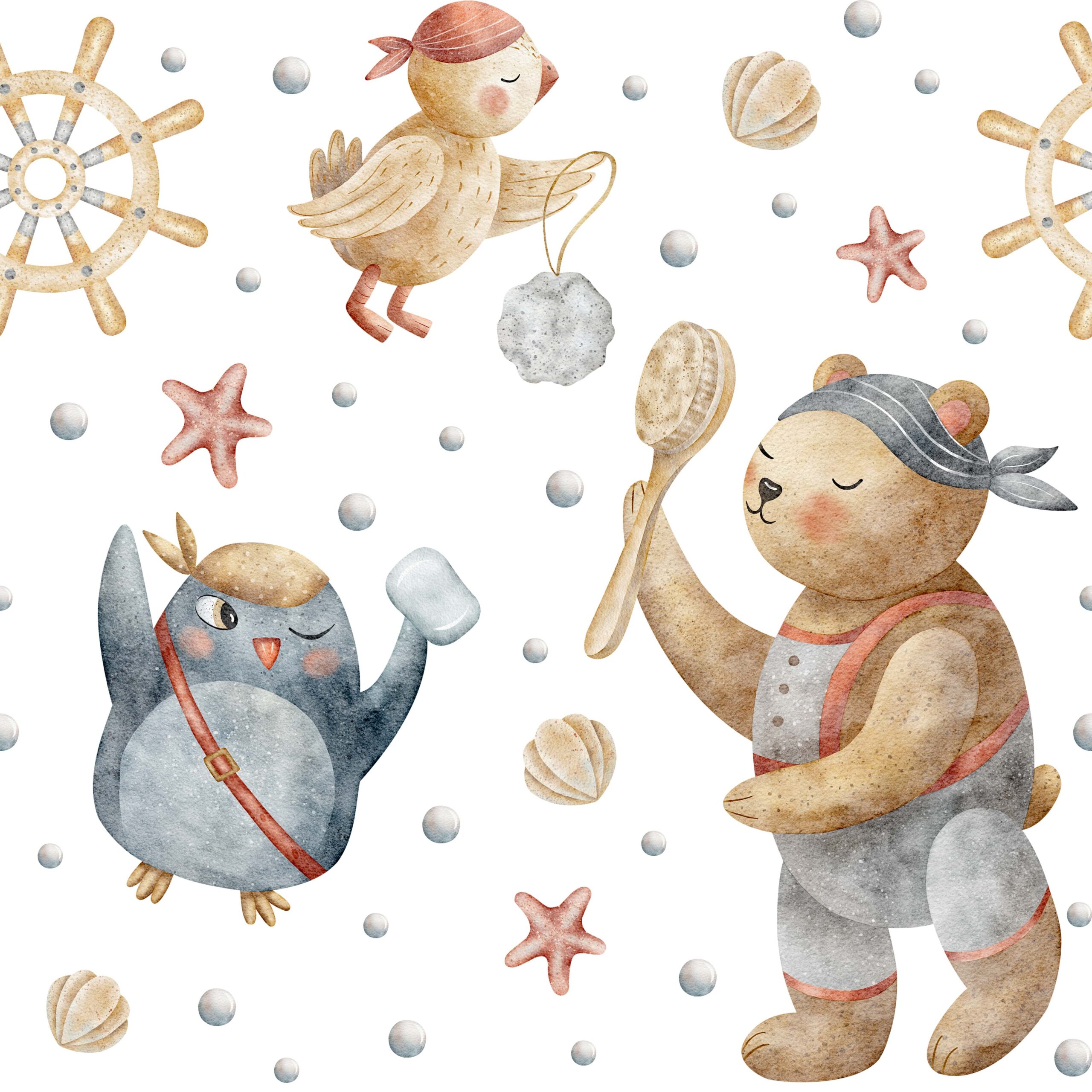 Introduceți un strop de fantezie și aventură maritimă în camera micuțului dumneavoastră cu fototapetul „Echipa Farselor Mari”. Acest model fermecător, pictat manual, înfățișează animale pirați prietenoase – un ursuleț de pluș, un pinguin și o pasăre – care descoperă împreună o lume subacvatică plină de scoici, stele de mare și cârme. Culorile calde, detaliile delicate în acuarelă și personajele prietenoase conferă interiorului un caracter de basm și o atmosferă confortabilă.