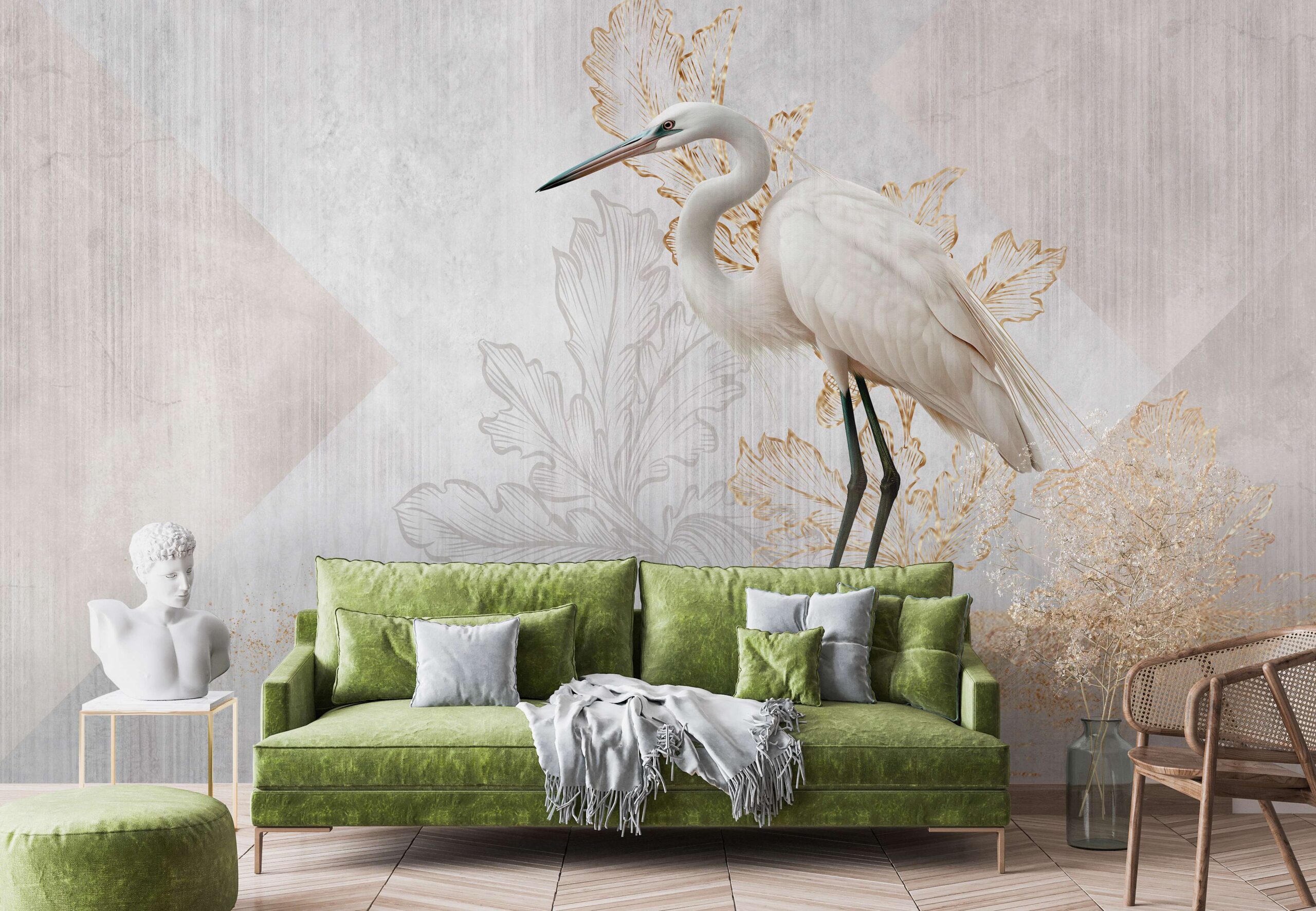 Introduceți o atmosferă unică de pace și rafinament în casa dvs. cu fototapetul „Eleganță Albă”. Această compoziție cu un design complex înfățișează o pasăre albă subțire, înconjurată de accente vegetale delicate, aurii, care adaugă subtilitate și clasă interiorului. Culorile deschise și estompate se îmbină perfect atât cu aranjamentele moderne, cât și cu cele clasice, creând un spațiu plin de armonie și luminozitate.