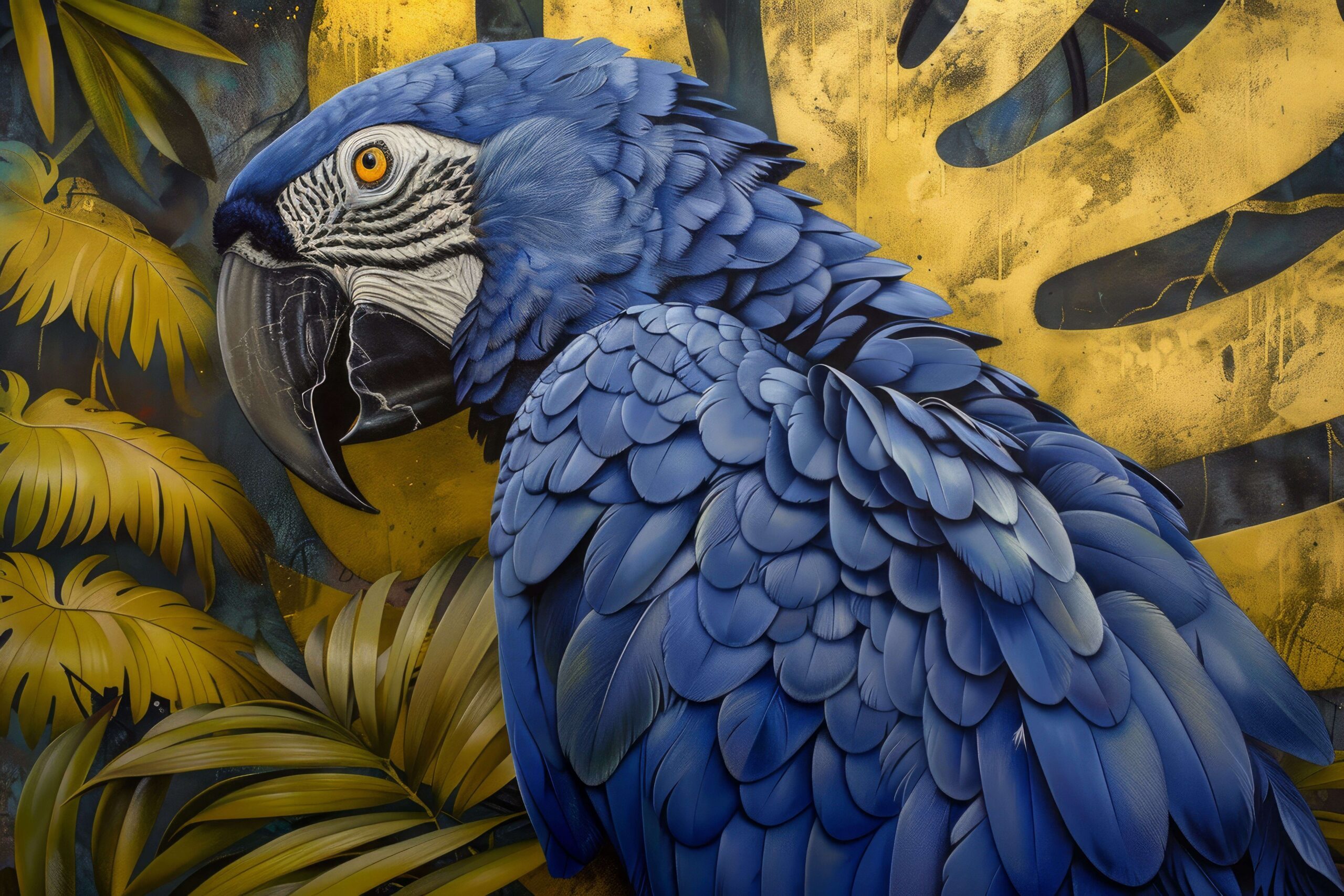 Introduceți o atmosferă unică în casa dvs. cu fototapetul „Blue Elegance”. Această imagine elaborată, detaliată, a unui papagal cu penaj albastru intens pe un fundal de frunze aurii evocă atmosfera tropicelor exotice, adăugând un caracter rafinat și proaspăt spațiului. Bogăția culorilor și jocul subtil de lumini completează perfect atât aranjamentele moderne, cât și pe cele clasice.