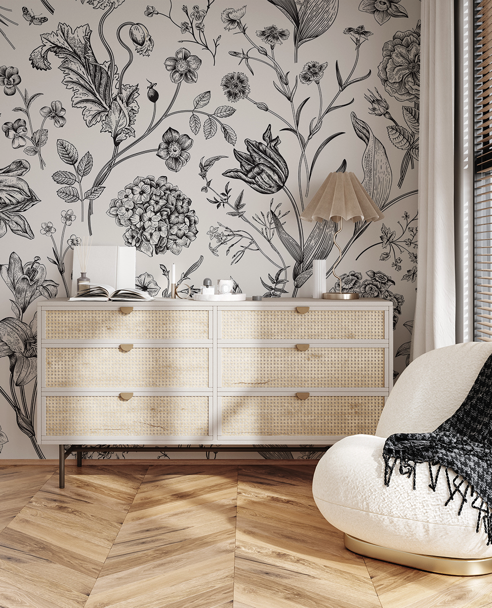 Aduceți o atmosferă unică în casa dvs. cu fototapetul „Eleganță Botanică Clasică”. Acest model floral alb-negru, elaborat cu minuțiozitate, evocă atmosfera gravurilor botanice clasice, adăugând o atmosferă rafinată și liniștită spațiului. Detaliile delicate și culorile atemporale se potrivesc perfect atât în aranjamentele tradiționale, cât și în cele moderne.