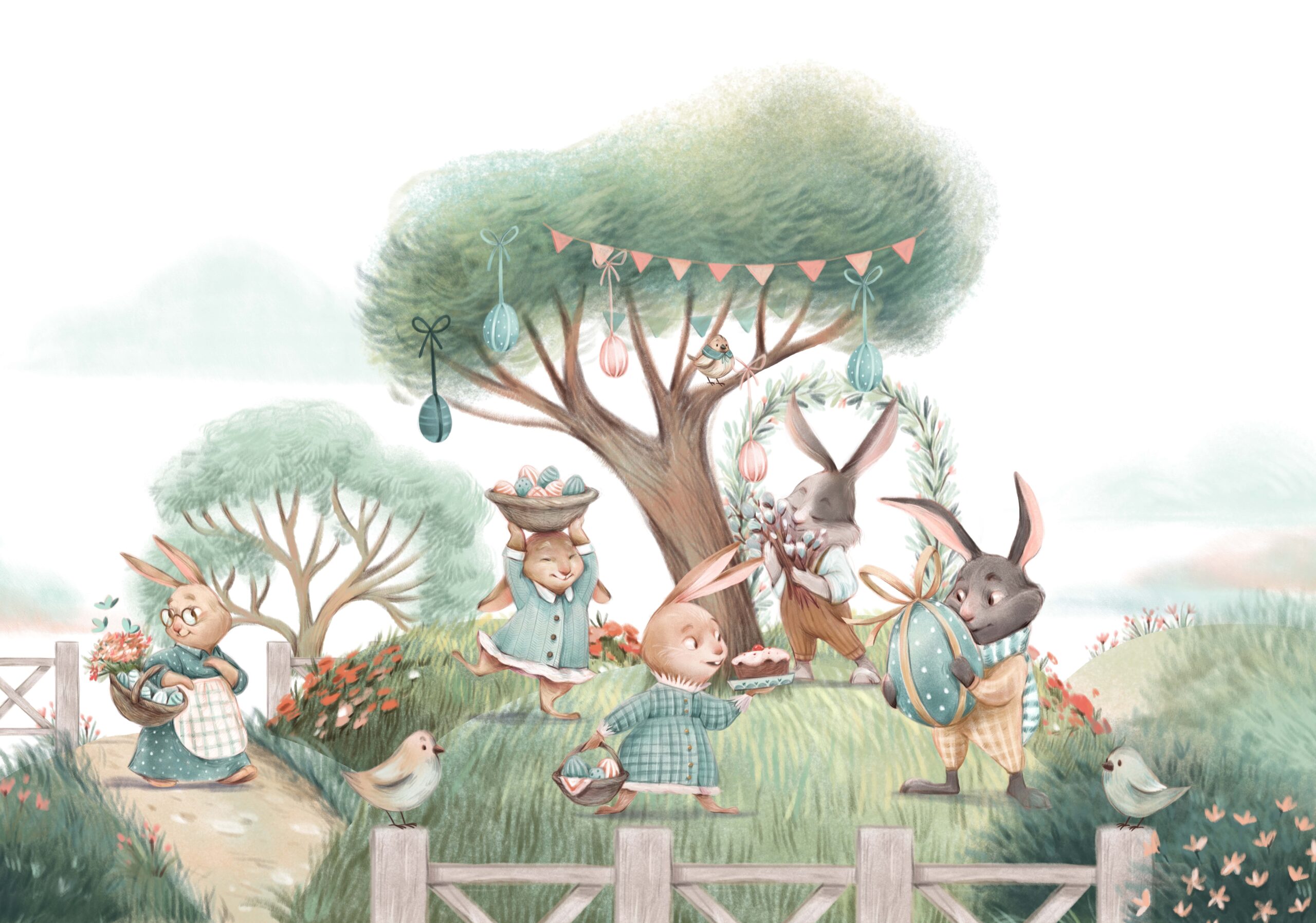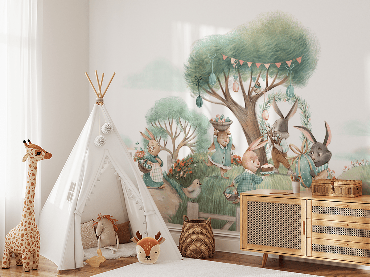 Fototapet „Iepurași de Paște” – Primăvară veselă, detalii colorate și o decorațiune fermecătoare pentru camera unui copil