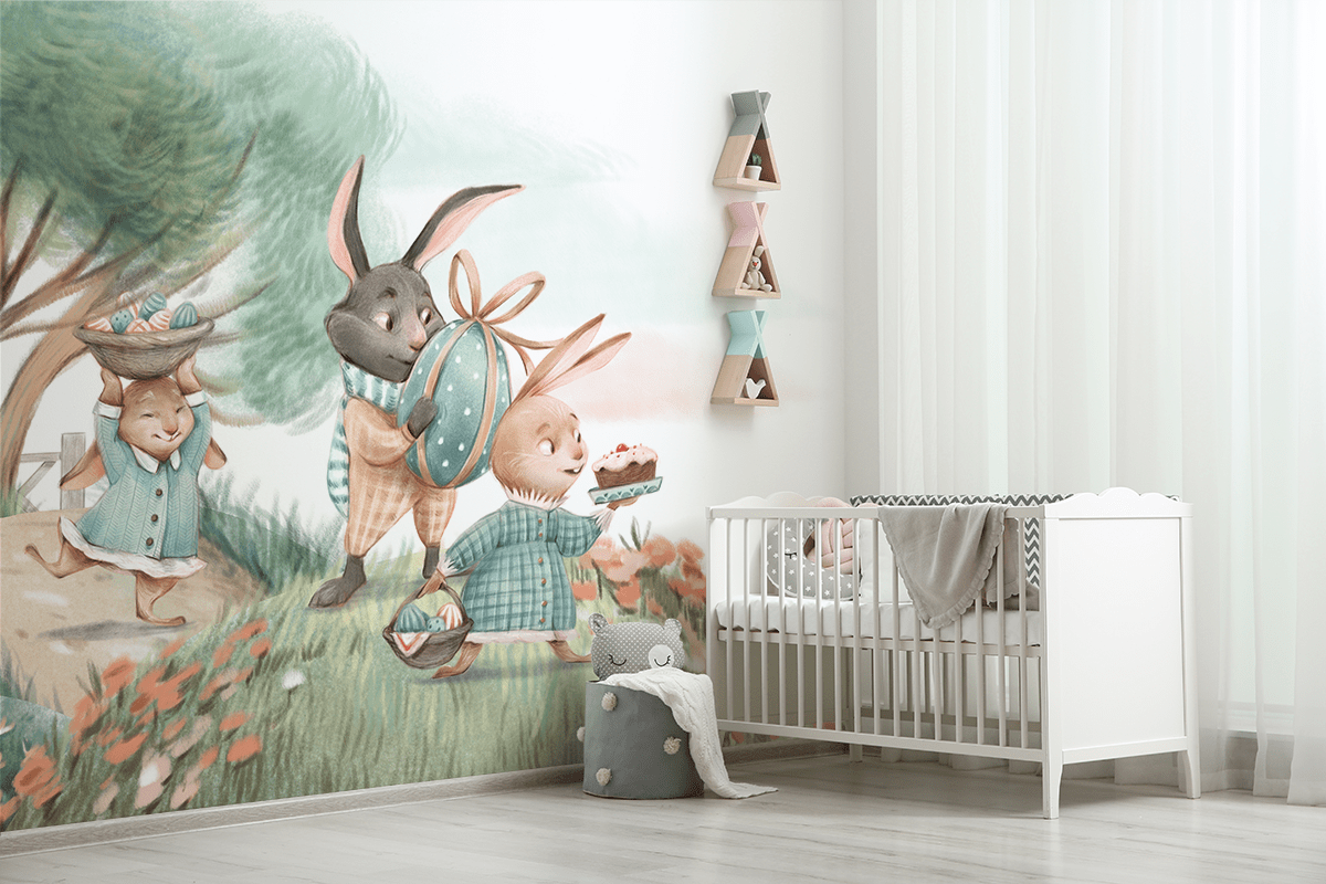 Fototapet „Iepurași Fericiți” – o aventură colorată, o dispoziție veselă și un decor fermecător pentru camera unui copil