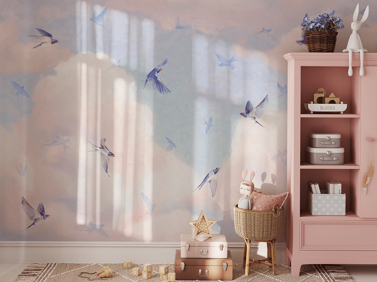 Creează un spațiu cu adevărat magic în camera copilului tău cu fototapetul „În îmbrățișarea norilor”. Acest model fermecător, pastelat, cu rândunele care alunecă pe un cer moale, roz și albastru introduce o atmosferă de ușurință, pace și imaginație copilărească. Culorile subtile și o compoziție delicată fac interiorul cald, confortabil și plin de farmec de basm.