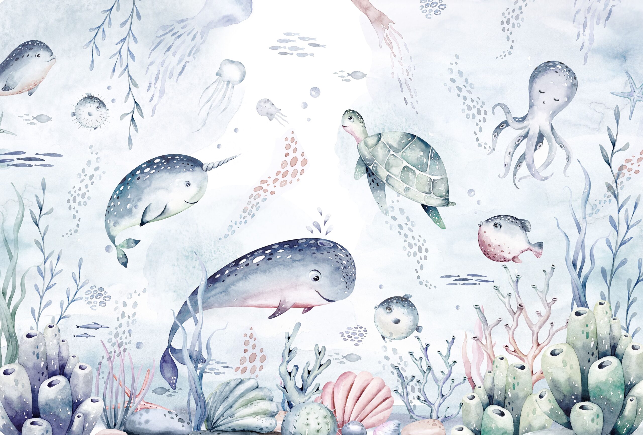 Transformă camera copilului tău într-un tărâm fermecat cu fototapetul „Big Sea Family”. Acest model fermecător, pictat manual, înfățișează locuitori prietenoși ai oceanului – de la un narval râzător, la o caracatiță curioasă, la pești veseli și o broască țestoasă calmă. Întregul lucru este decorat în culori pastelate delicate, care aduc armonie, pace și bucurie copilărească în interior.