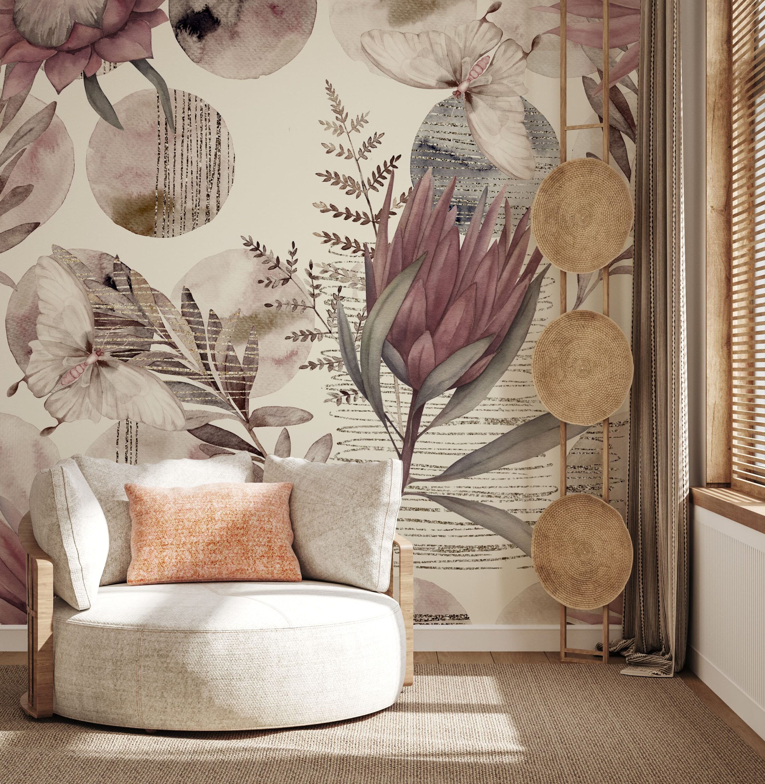 Introduceți o atmosferă unică în interiorul dvs. cu fototapetul „Botanical Melody”. Acest model delicat, în acuarelă, inspirat de natură, combină motive de flori, frunze și fluturi cu culori moi, estompate de roz, bej și gri. Îmbogățită cu detalii aurii și texturi grafice, compoziția creează o atmosferă elegantă și plină de grație.