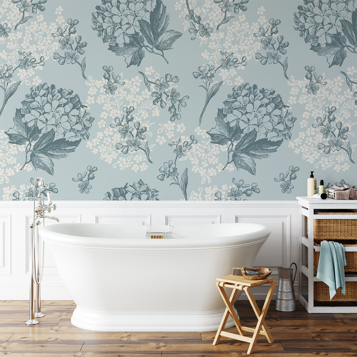 Fototapetul „Nostalgia Albastră” – eleganță subtilă, liniște florală și stil atemporal