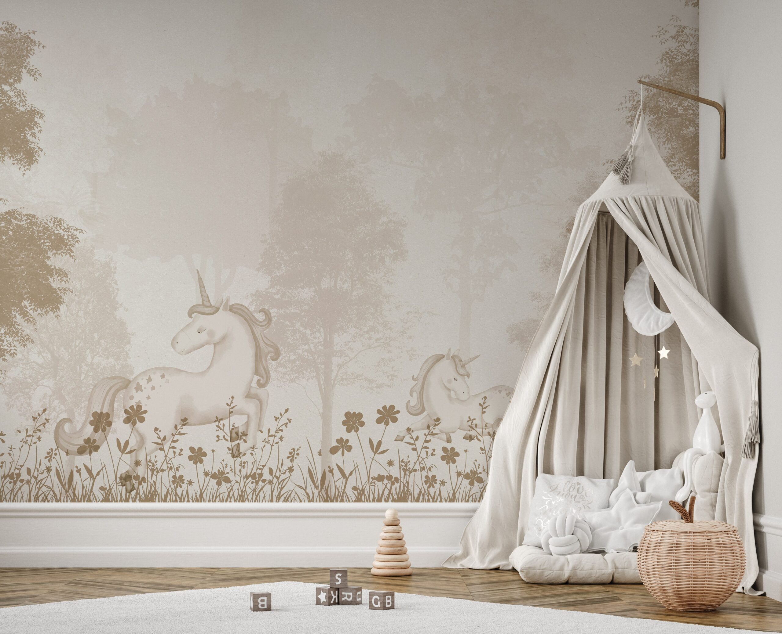 Aduceți o atmosferă magică în camera copilului dumneavoastră cu fototapetul „Pădurea misterioasă cu unicorni”. Acest model delicat, în culori estompate, înfățișează unicorni fermecători care rătăcesc printr-o pădure magică printre flori, copaci și vegetație forestieră. Ilustrația subtilă creează o atmosferă calmă, visătoare, perfectă pentru relaxare și visare.