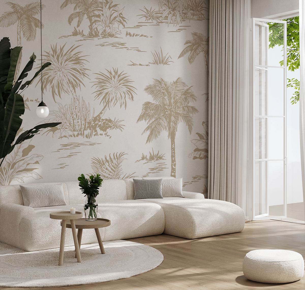 Transportați-vă într-o oază de liniște cu fototapetul „Desert Palms”. Acest model subtil, monocromatic, cu palmieri și vegetație în nuanțe delicate de bej evocă atmosfera peisajelor deșertice, introducând o aură unică de relaxare și căldură spațiului. Detaliile minimaliste și culorile clasice se îmbină perfect atât cu designurile interioare moderne, cât și cu cele clasice.