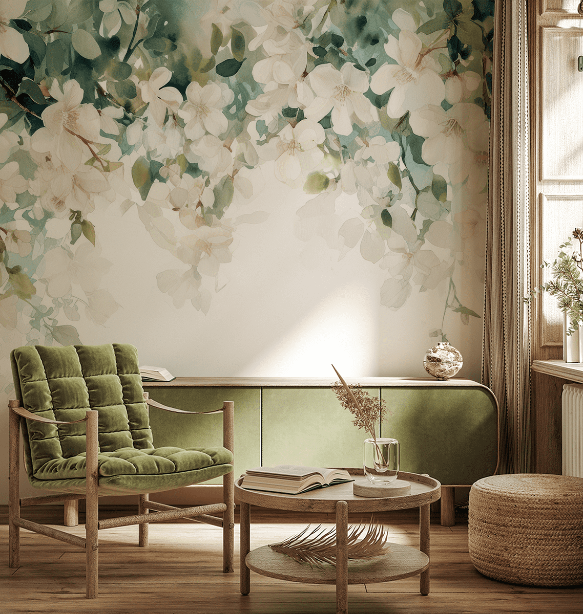 Fototapetul „Ploaie de flori” – Luminozitate subtilă, armonie naturală și un decor interior proaspăt