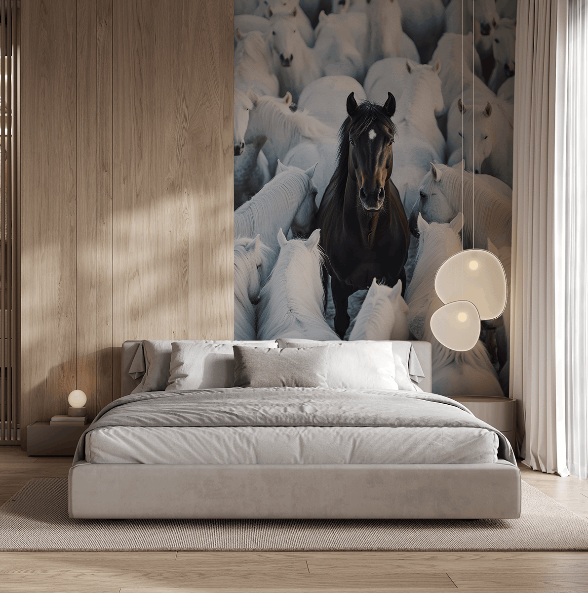 Introduceți un caracter unic în interiorul dvs. cu fototapetul „Printre Alb”. Reprezentând un cal negru maiestuos înconjurat de o turmă de cai albi, această compoziție încântă prin contrastul și simbolismul său, creând un punct focal intrigant în orice spațiu. Jocul subtil de lumină, liniile moi ale siluetei și detaliile perfecte conferă imaginii profunzime și eleganță.