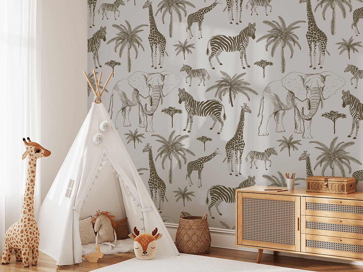 Fototapet „Safari în palmieri” – o aventură veselă, o atmosferă tropicală și un decor exotic pentru camera unui copil
