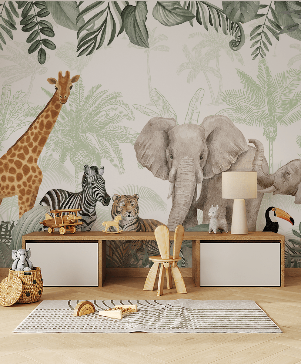 Fototapet „Safari Tropical” – O aventură colorată și lumea magică a animalelor sălbatice pentru micii exploratori