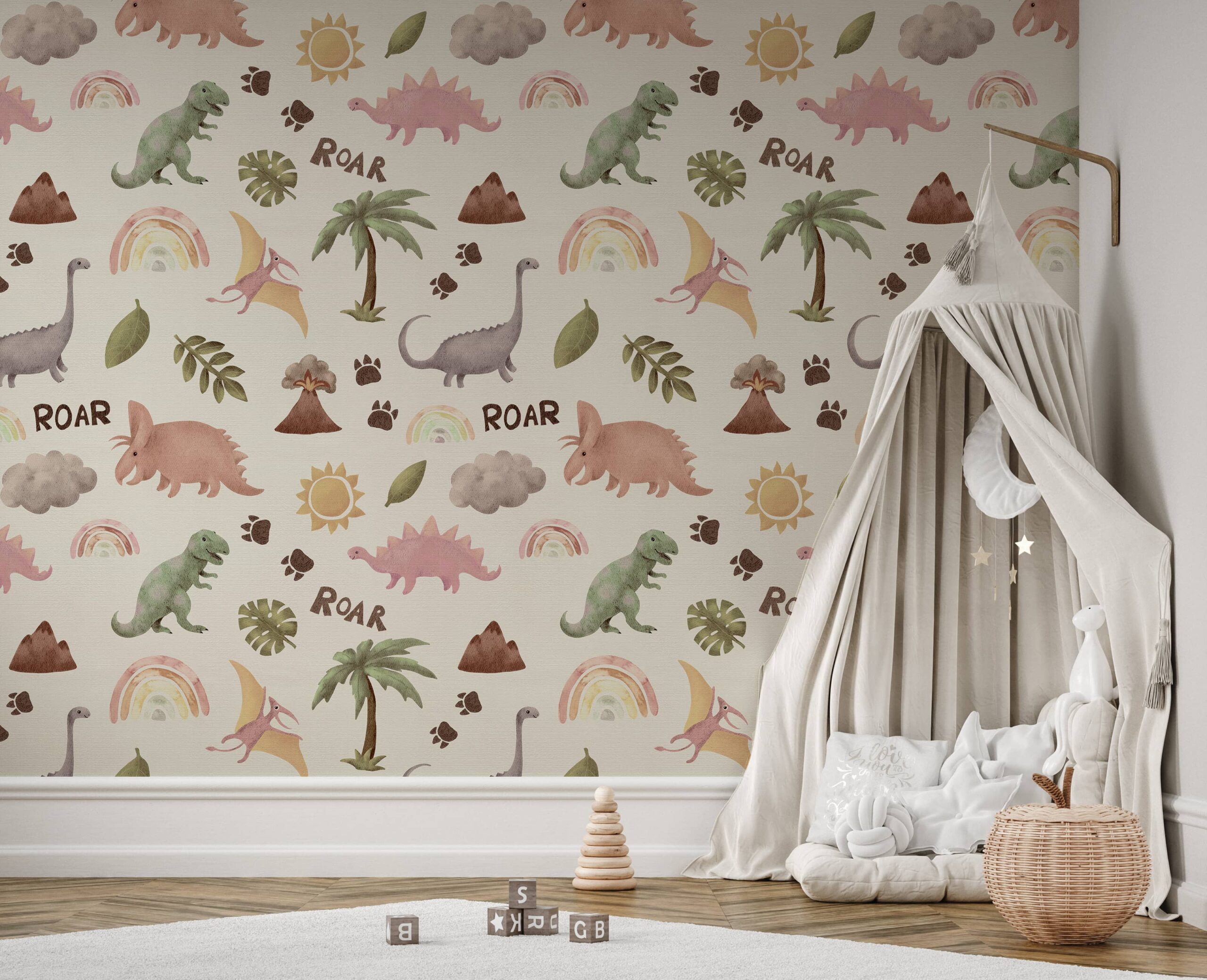 Aduceți o aventură de neuitat în casa dvs. cu fototapetul „Jurassic Terrain”. Modelul colorat cu desene cu dinozauri vă va transporta în vremurile în care aceste creaturi preistorice stăpâneau Pământul. Detalii delicate, precum tiranozaurii maiestuoși și stegozaurii veseli, creează o atmosferă plină de energie și distracție, perfectă pentru micii exploratori.