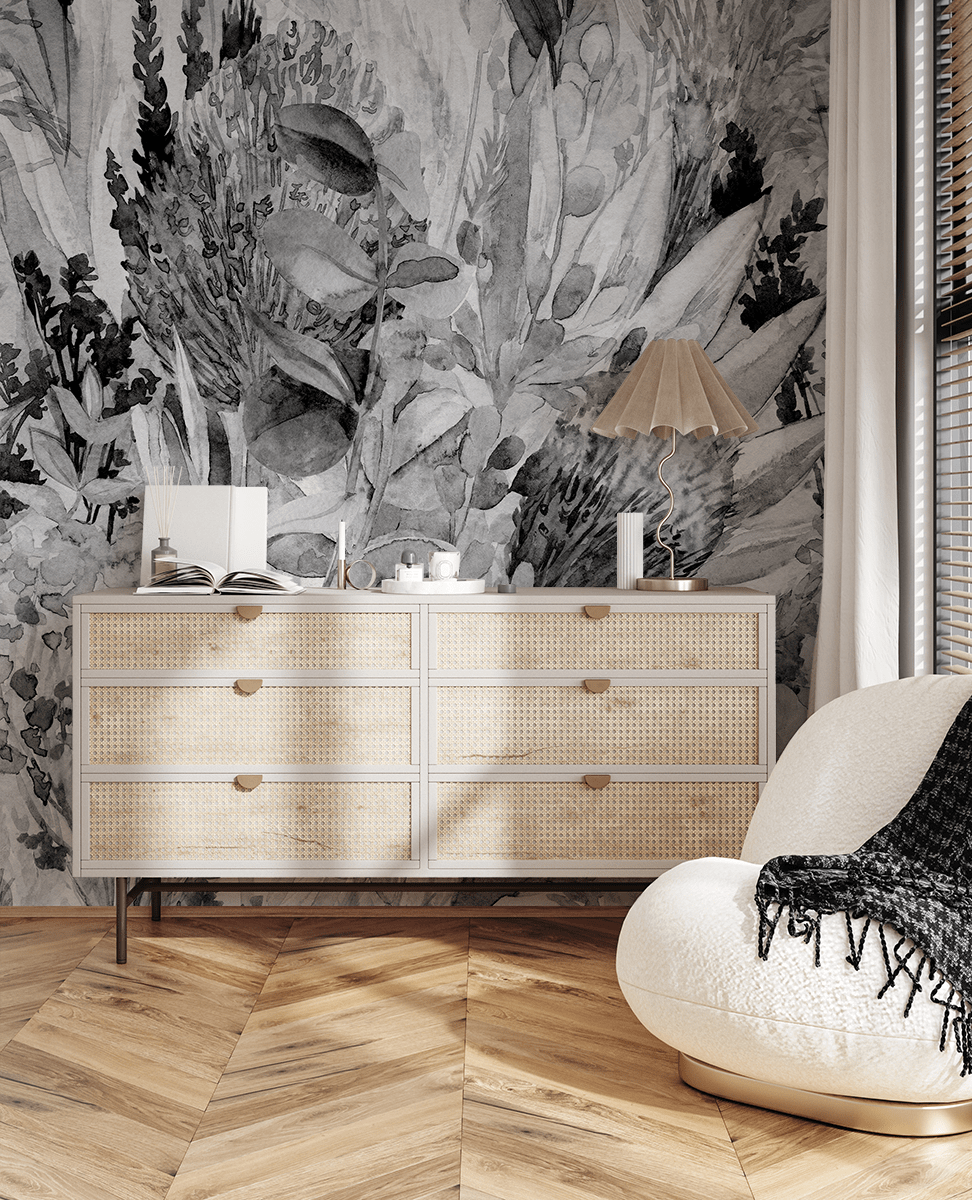Aduceți o atmosferă unică în casa dumneavoastră cu fototapetul „Umbrele Naturii”. Acest model unic, alb-negru, cu plante, inspirat de ilustrațiile în acuarelă, evocă pacea și armonia naturii, conferind spațiului un caracter artistic și sofisticat. Tranzițiile tonale delicate și motivele naturale se îmbină perfect cu o varietate de stiluri de design interior – de la modern la clasic.