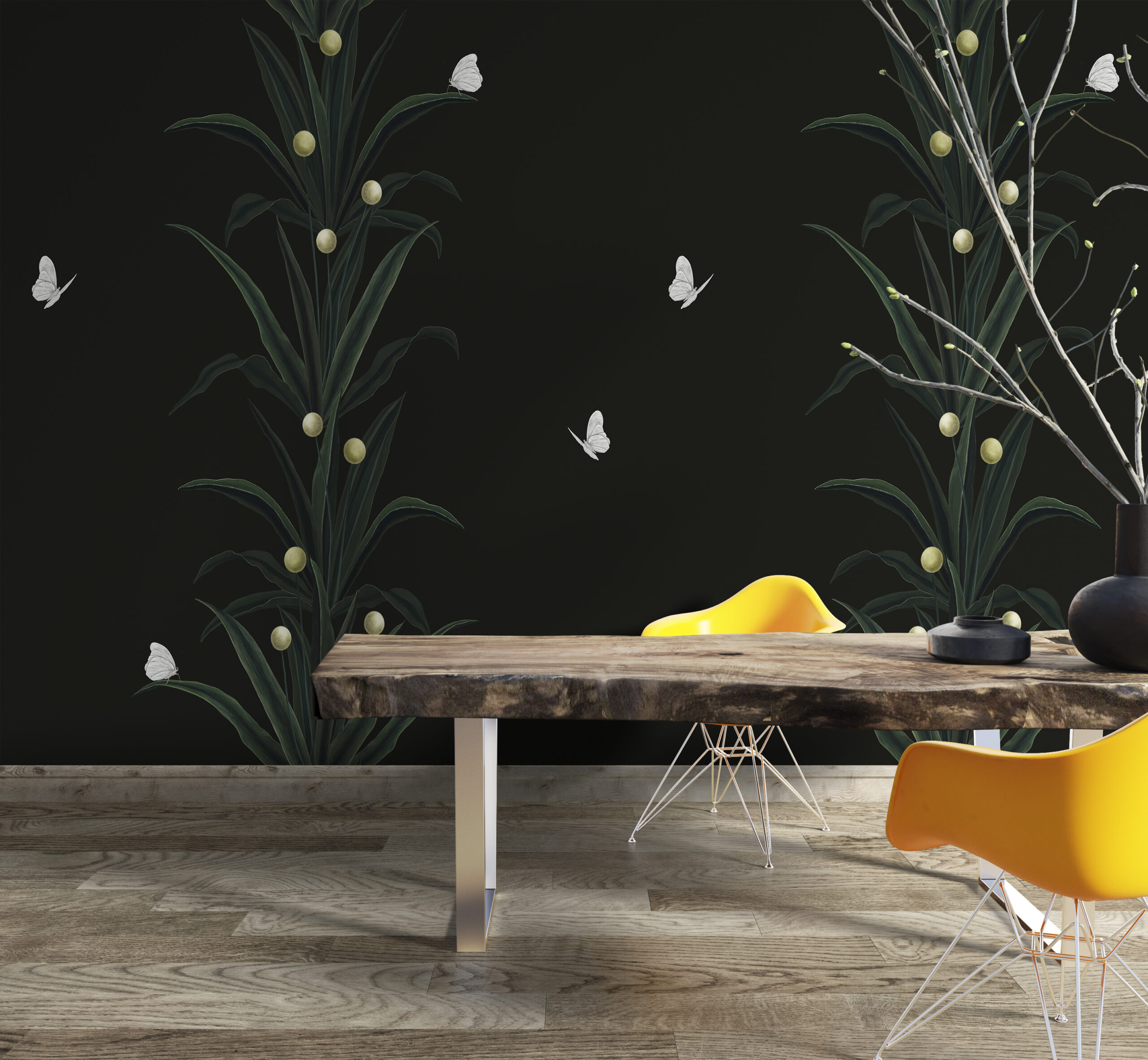 O pictură murală atrăgătoare care prezintă o varietate de plante pe un fundal negru elegant. Acest decor unic se va potrivi perfect în interioarele moderne, adăugând un farmec unic și un caracter confortabil.